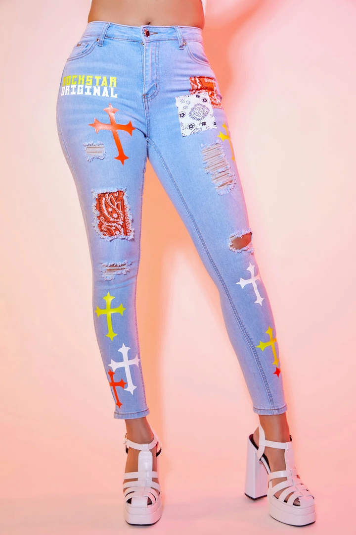 Rockstar Original Women’s denim jean in light wash. Featuring a printed RSO logo with multi color cross graphics and paisley patches to match. Accenting a high-waisted, relaxed silhouette with distressed detailing throughout. Style with a bandeau top for a casual Rockstar babe look.