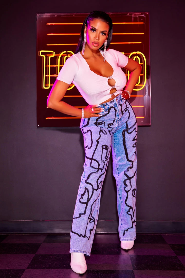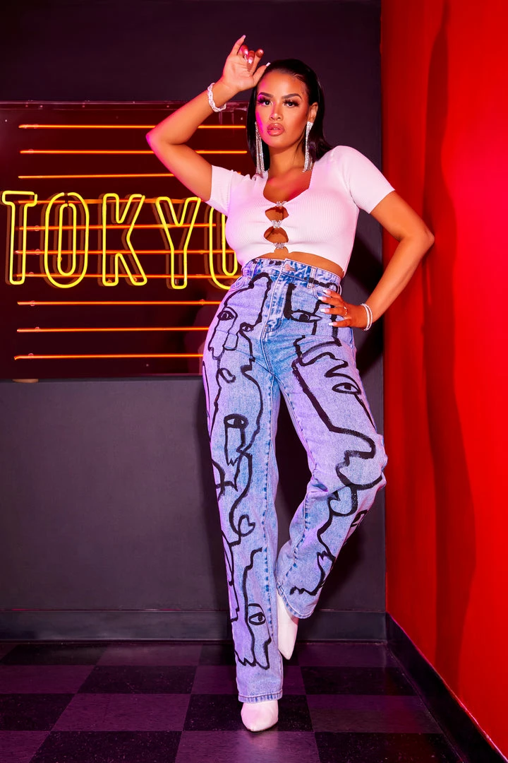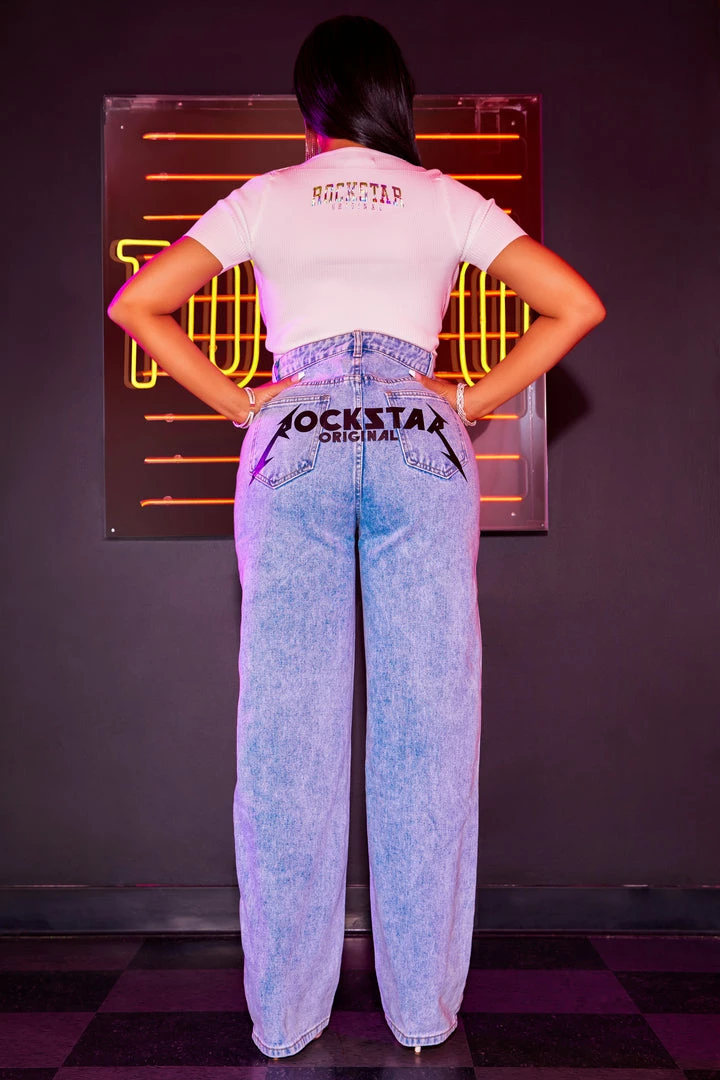 Rockstar Original Women’s wide leg denim jean in light wash. Featuring Picasso inspired designing throughout. Accenting a high-waisted, relaxed silhouette and distressed detailing. Designed with premium cotton threading for a comfortable boss babe staple piece!