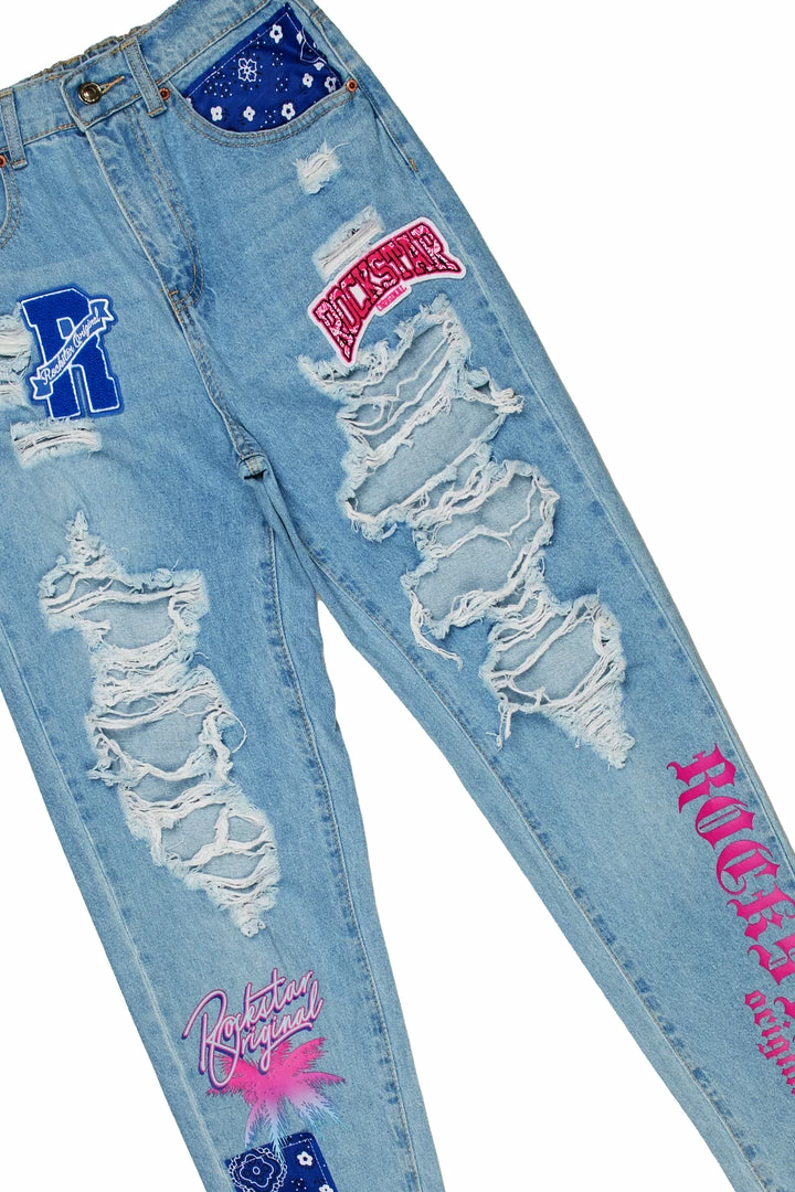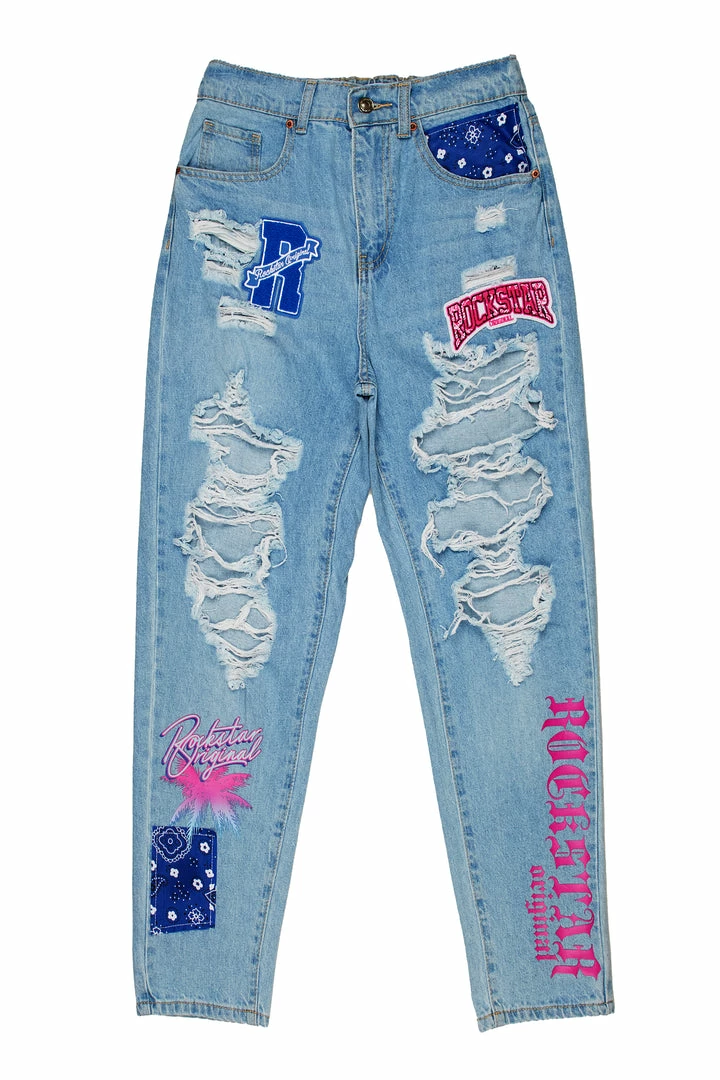 Rockstar Original Women’s wide leg denim jean in light wash. Featuringย Varsity style patches with multi color paisley patches throughout. Accenting a high-waisted,ย relaxed silhouette and distressed detailing throughout. Designed withย premium cotton threading forย a comfortable boss babe staple piece!