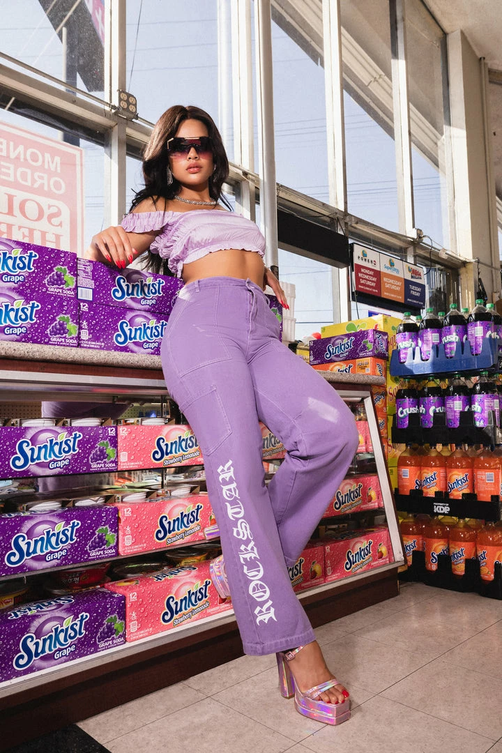 Rockstar Original Women’s denim cargo jean in purple. Featuring printed RSO logos above the hems with a wide leg design. Accenting a front button closure with utility pockets and an elastic waistband. Style with a cropped tee and sneakers for a casual Rockstar babe outfit!