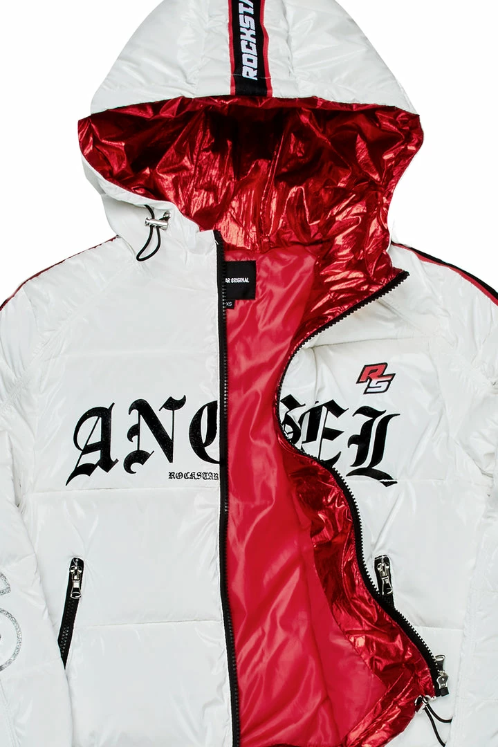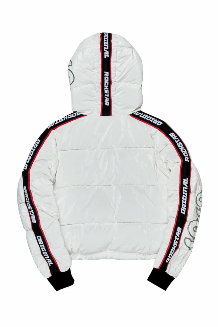 Rockstar Original Women’s crop puffer jacket in pure white. Featuring embroidered RSO logos on the sleeves with printed graphics throughout — your winterwear game will level up with this piece. Accenting versatile material to keep you cool, comfortable, functional and fashionable. This new must-have bubble coat is styled with a drawstring fastening hood, high quality zipper pockets and a zipper closure. Turn up the heat this winter season!