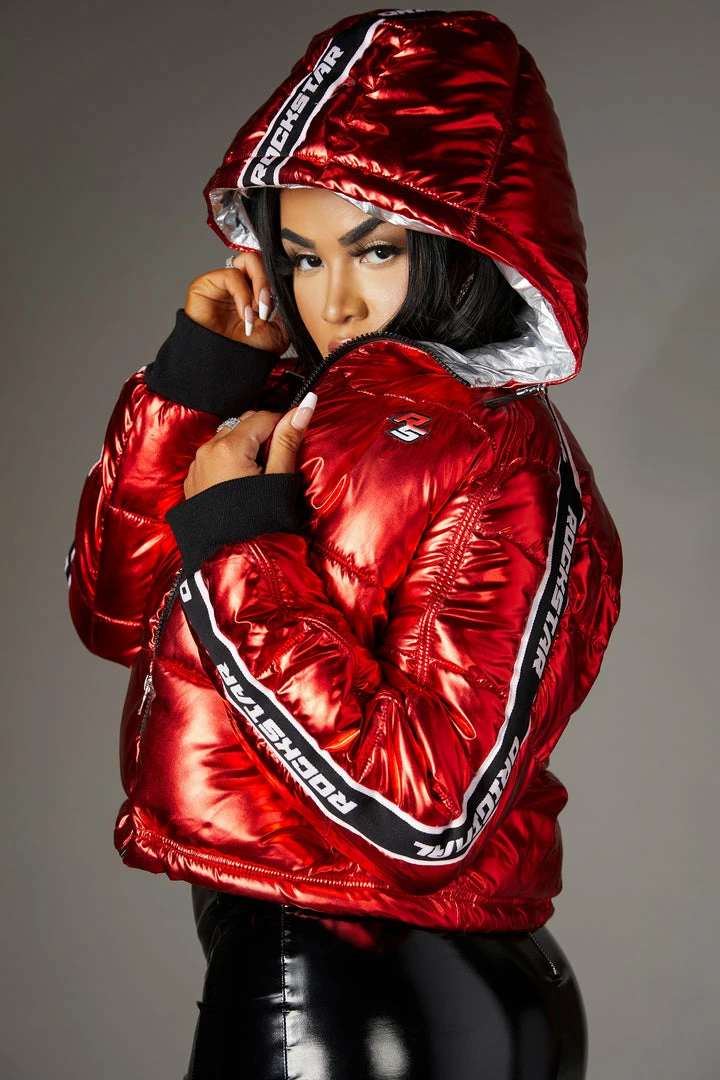 Rockstar Original Women’s crop puffer jacket in metallic red. Featuring embroidered RSO logos on the sides of the sleeves — your winterwear game will level up with this piece. Accenting versatile material to keep you cool, comfortable, functional and fashionable. This new must-have bubble coat is styled with a drawstring fastening hood, high quality zipper pockets and a zipper closure. Turn up the heat this winter season!