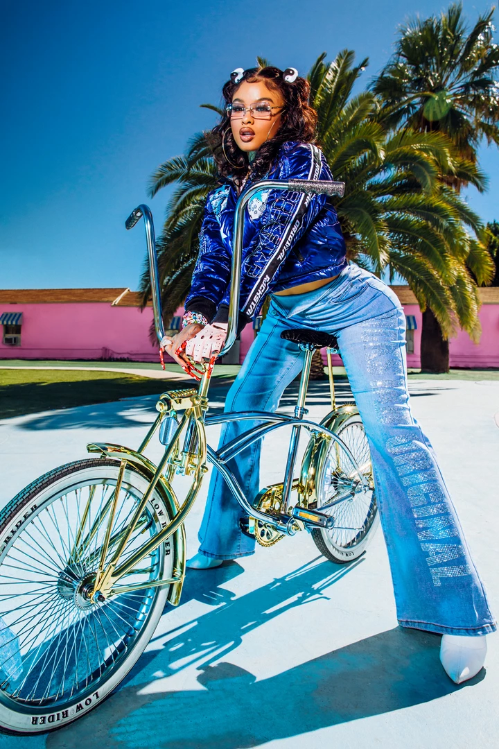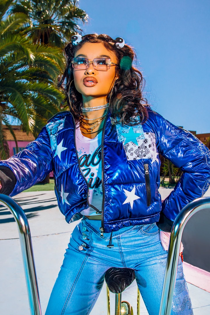 India Love in Rockstar Original Women’s crop puffer jacket in metallic blue. Featuring embroidered RSO logos on the sleeves with embroidered paisley patches, printed butterflies and star graphics throughout — your layered look will level up with this piece. Accenting versatile material to keep you cool, comfortable, functional and fashionable. This new must-have bubble coat is styled with a drawstring fastening hood, high quality zipper pockets and a zipper closure.