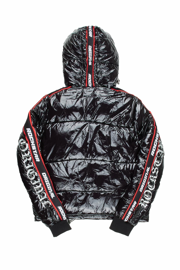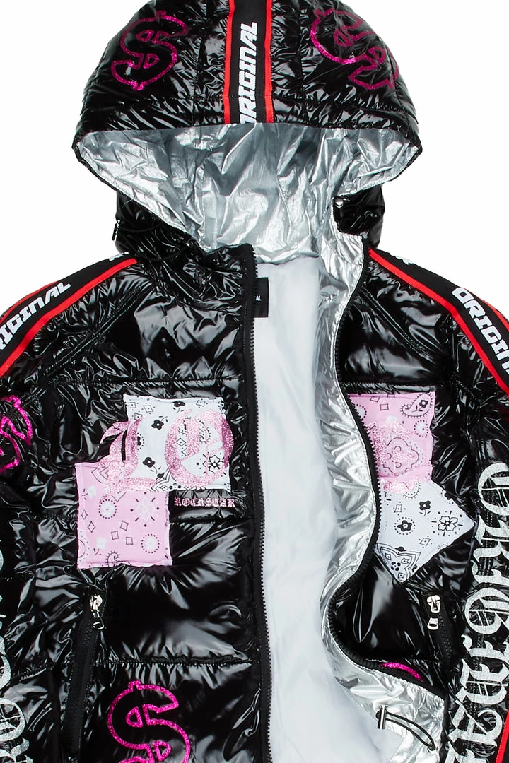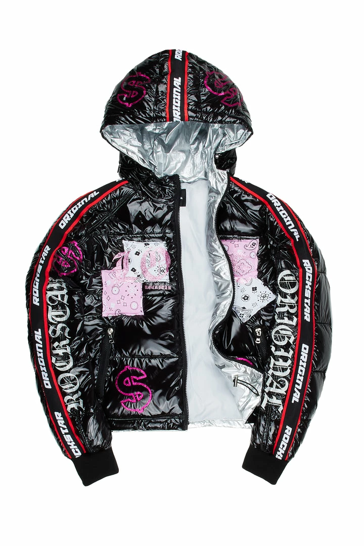 Rockstar Original Women’s cropย puffer jacket in gleaming black. Featuring embroidered and rhinestone RSO logos on the sides of the sleeves with an embroidered varsity number and printed star graphics throughout โ your layer game will level up with this staple piece. Accenting versatile material to keep you cool, comfortable, functional and fashionable. Thisย newย must-have bubble coatย is styled with aย drawstring fastening hood, high quality zipper pocketsย and a zipper closure.ย