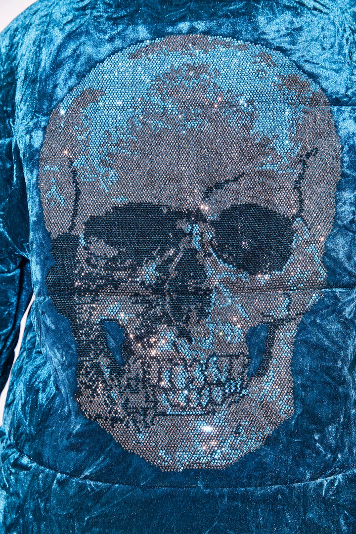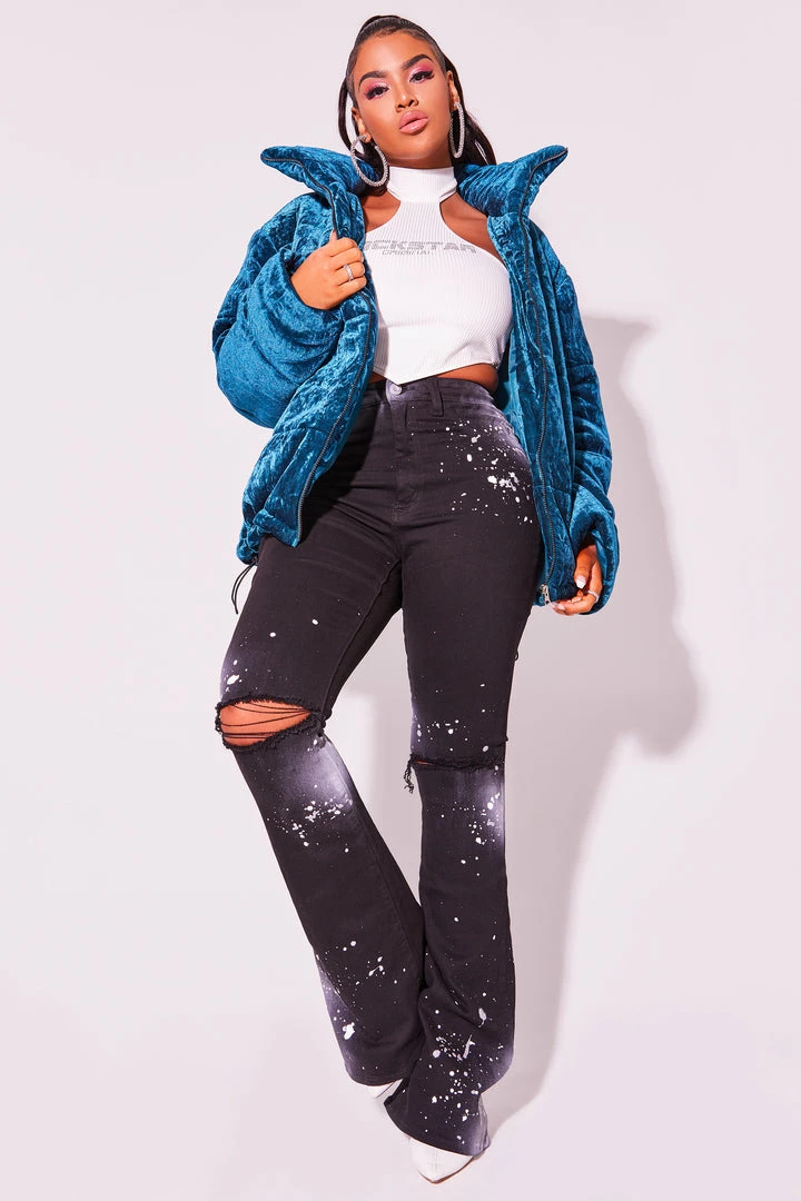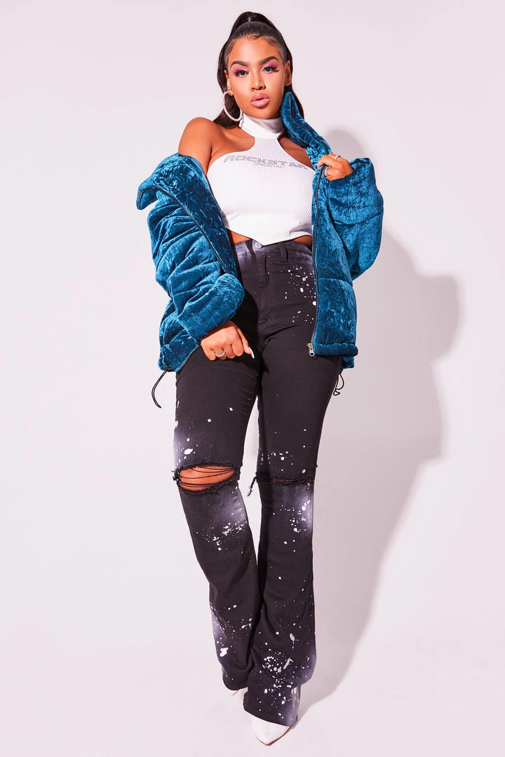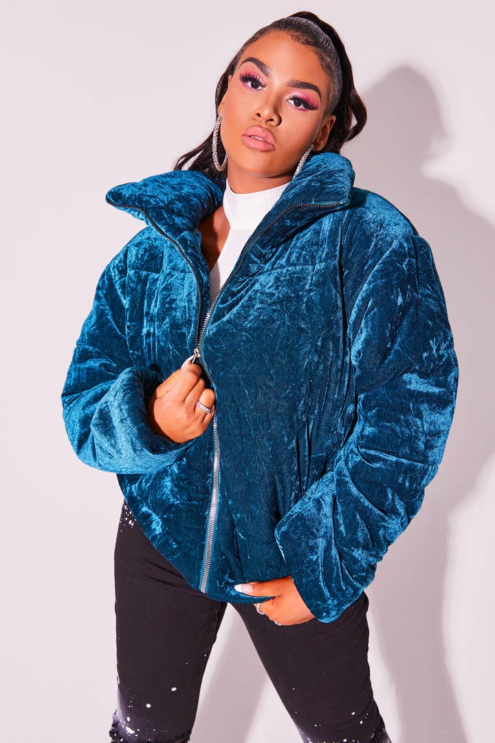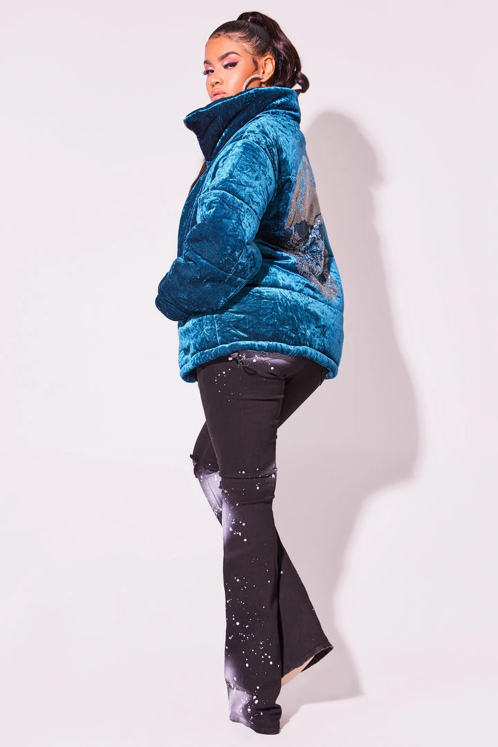 Rockstar Original Women’s crop puffer jacket in sweet teal. Featuring a posterior rhinestone graphic — your winterwear game will level up with this piece. Accenting versatile material to keep you cool, comfortable, functional and fashionable. This new must-have puff coat is styled with a drawstring fastening waistband, a high quality zipper closure and a gorgeous velvet finish. Turn up the heat this winter season!