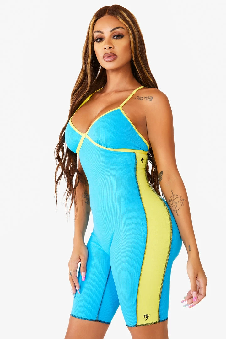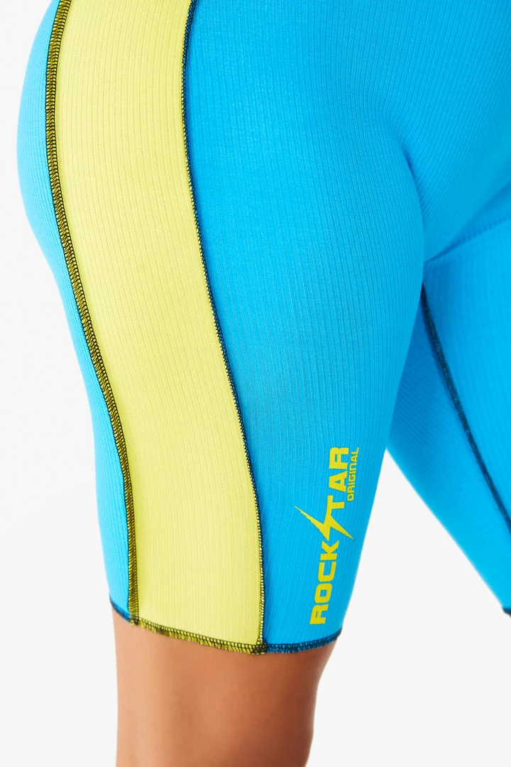 Rockstar Original Women’s halter lace-up romper in rib-jersey with contrast pipping and side seam inserts.