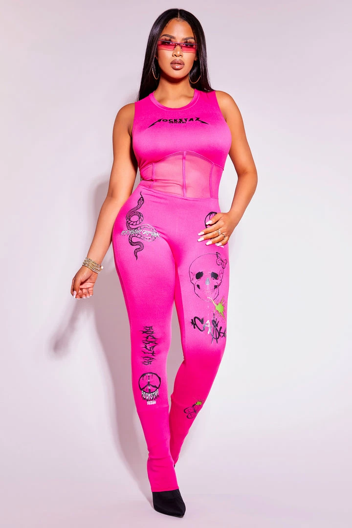Rockstar Original Women’s one-piece sleeveless jumpsuit in sweet pink. Featuring printed RSO logos with multi graphics throughout. Accenting a high quality stand-up zip closure/collar combo and a luxurious form-fitting silhouette. Style with booties or nude heels for the hottest Rockstar babe OOTD.