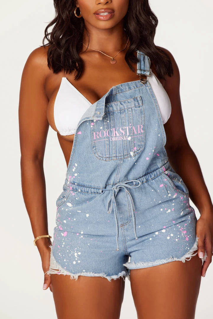 Rockstar Original Women’s denim overall in light wash. Featuring printed RSO logos across the bust with custom paint splatter throughout. This gorgeous one-piece ensemble accents button hook straps, multiple pockets and a drawstring waistband with distressed details. Style with a plain tee or bikini top for the perfect all day outfit.