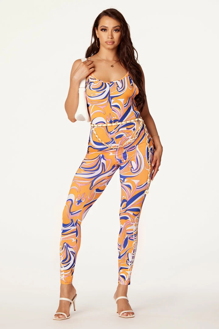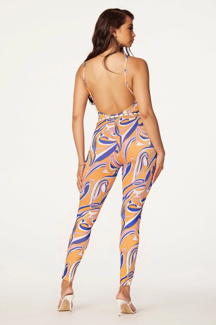 Rockstar Original Women’s one-piece romper in multi pattern orange. Featuring printed RSO logos down the legs. Accenting a scoop neckline with an exposed back and a form-fitting silhouette.