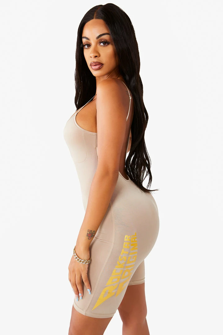 Rockstar Original Women’s spaghetti strap dressy biker short romper with adjustable straps and bold Rockstar Original logos, a perfect closet basic for day or night.