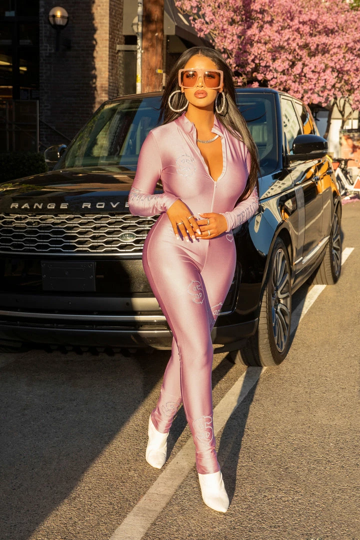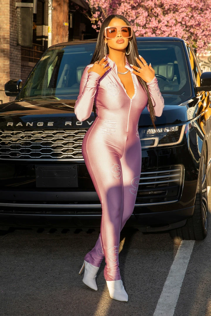 Rockstar Original Women’s one-piece long sleeve jumpsuit in sweet pink. Featuringย rhinestone RSO logos down the sleeve with flitter money signs throughout. Accenting a high quality stand-up zip closure/collar combo and a luxurious form-fitting silhouette. Style with booties or nude heels for the hottest Rockstar babe OOTD.