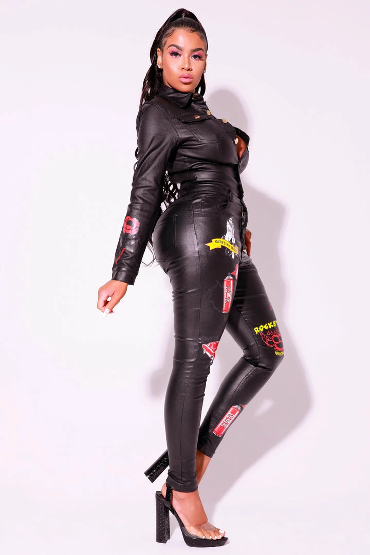 Rockstar Original Women’s faux leather jumpsuit in shimmering black. Featuring printed RSO logos and high quality button closures throughout in gorgeous gold. This boss babe fit accents a collared neckline and form-fitting silhouette that will hug every curve in all the right places. Less is definitely more with this all-in-one ensemble!