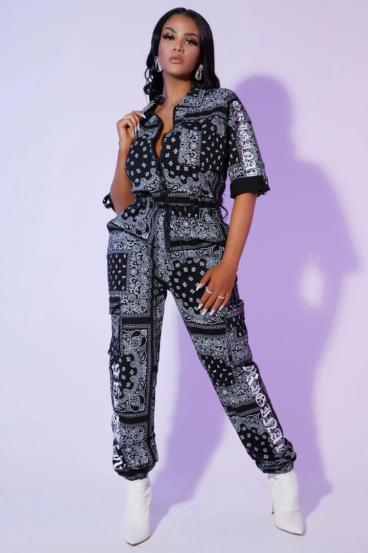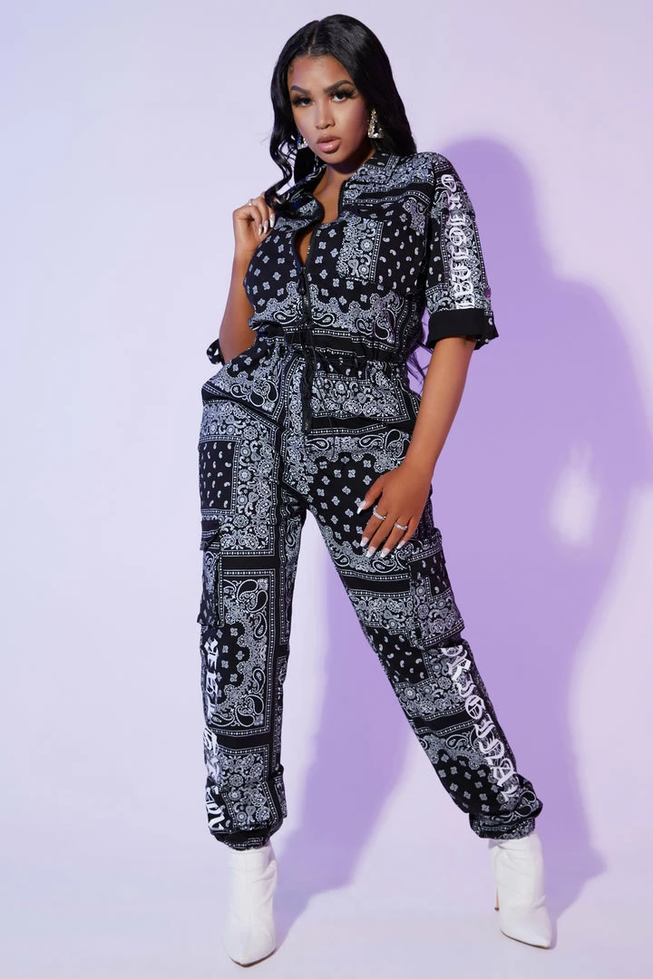 Rockstar Original Women’s denim jumpsuit. Featuring a graphic paisley print pattern throughout with cuffedย hems, a collared neckline and a high quality front zipper closure. Less is definitely more with this all-in-one ensemble! Style with nude heels and your favorite hoop earrings for the hottest OOTD!