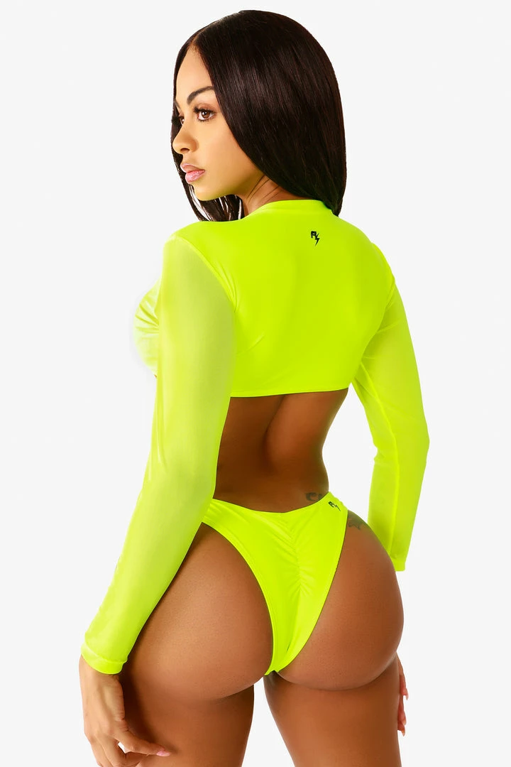 Rockstar Original Women’s long sleeve biking 2 piece set with long sleeve top with mesh sleeves and cheeky v-shape bikini bottom.