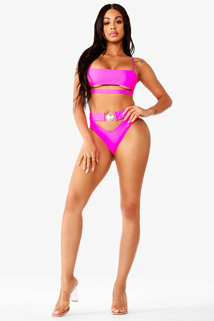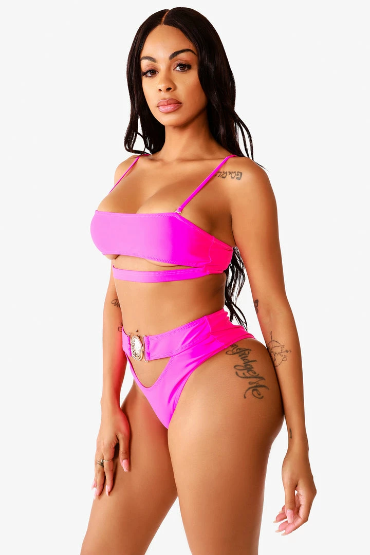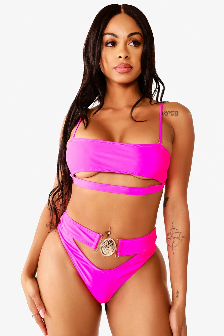 Rockstar Original Women’s two-piece bikini with high rise bottom with gold belt buckle and under-boob peek-a-boo bikini tube top with mini Rockstar Original logo.