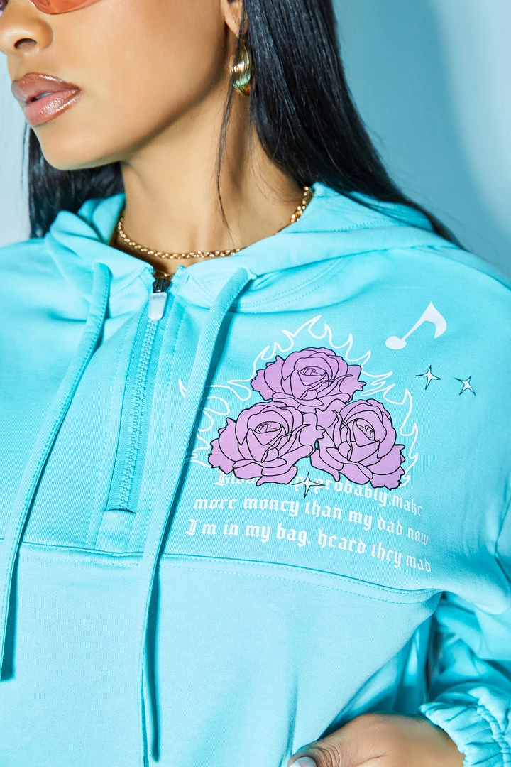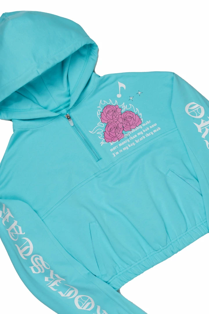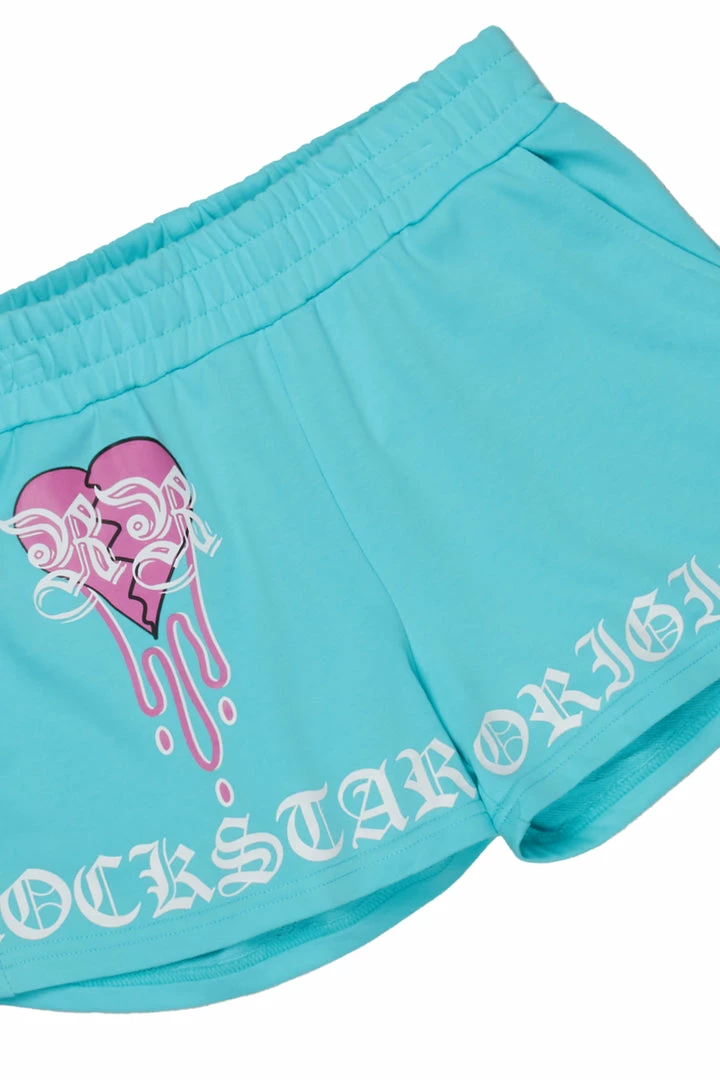 Rockstar Original Women’s two-piece short set in turquoise. Featuring printed RSO logos with paisley patches throughout the top and bottom. Top accents a mini length with ribbed cuffs, an elastic hem and drawstring hoodie while bottoms accent an elastic waistband and side pockets. Style with your favorite sneakers for a sporty Rockstar babe OOTD!