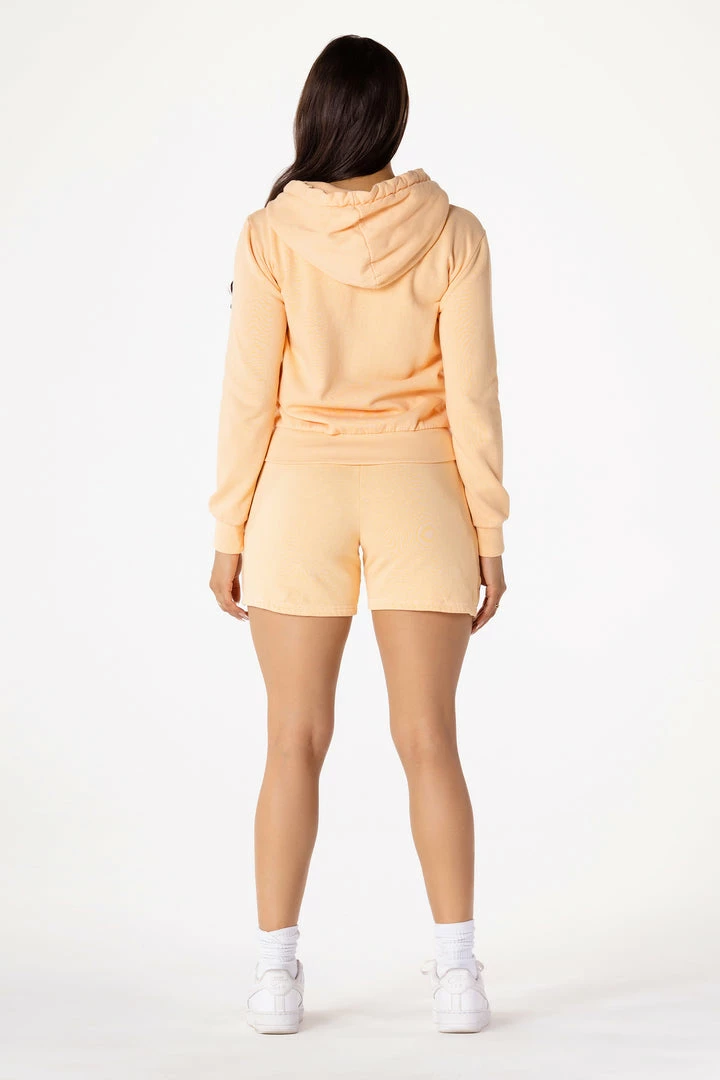 Rockstar Original Women’s essential two-piece short set in peach. Featuring printed RSO logos on the top and bottoms. Jacket accents a mini length with a high quality zipper closure, a drawstring hood and elastic ribbed hem while bottoms accent an elastic ribbed waistband with side pockets.