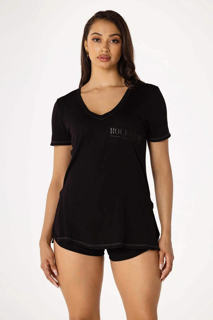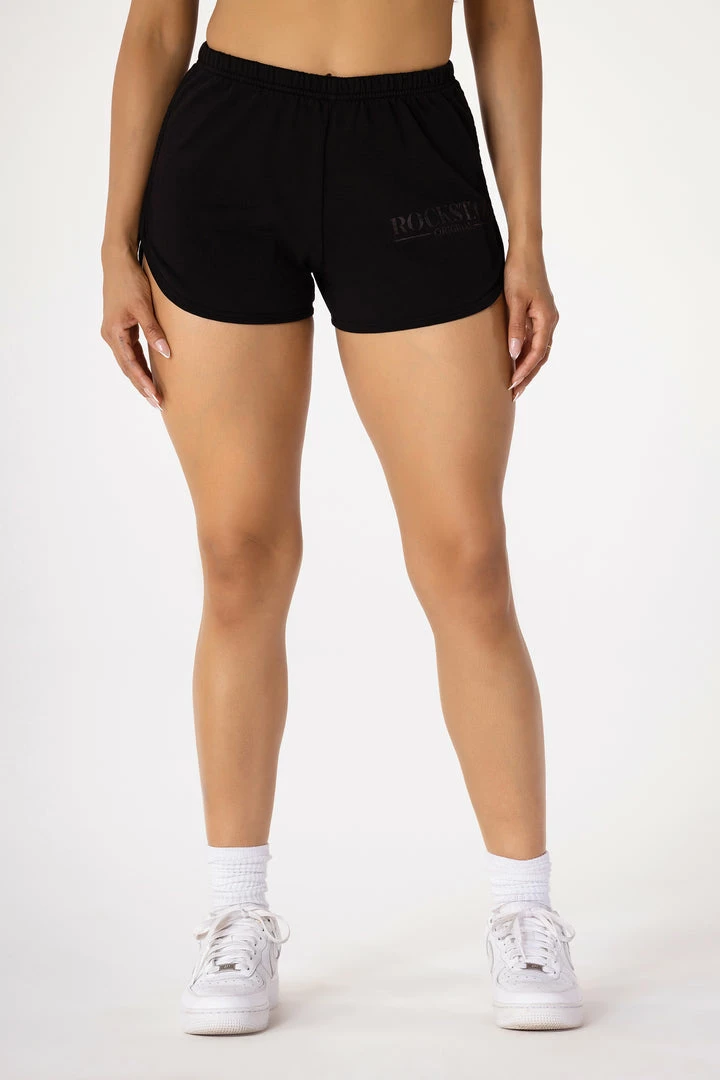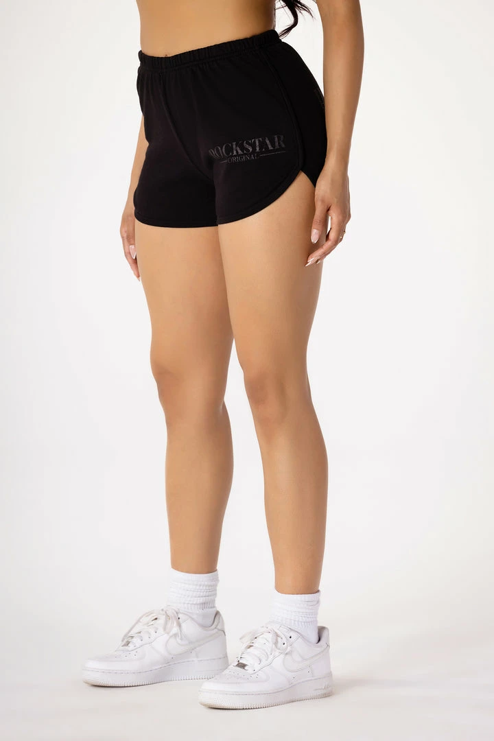 Rockstar Original Women’s essential two-piece short set inย black. Featuring printed RSO logos on the top and bottoms. Jacket accents a mini length withย a high quality zipper closure, aย drawstringย hood and elastic ribbed hem while bottoms accent an elastic ribbed waistband with side pockets.ย