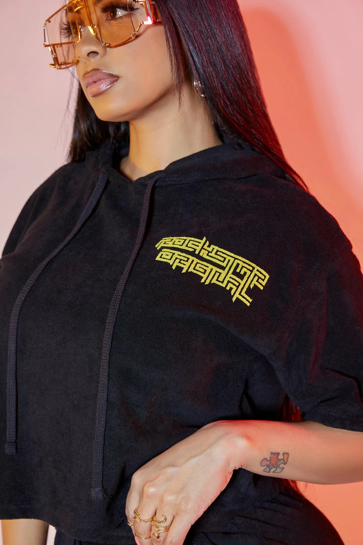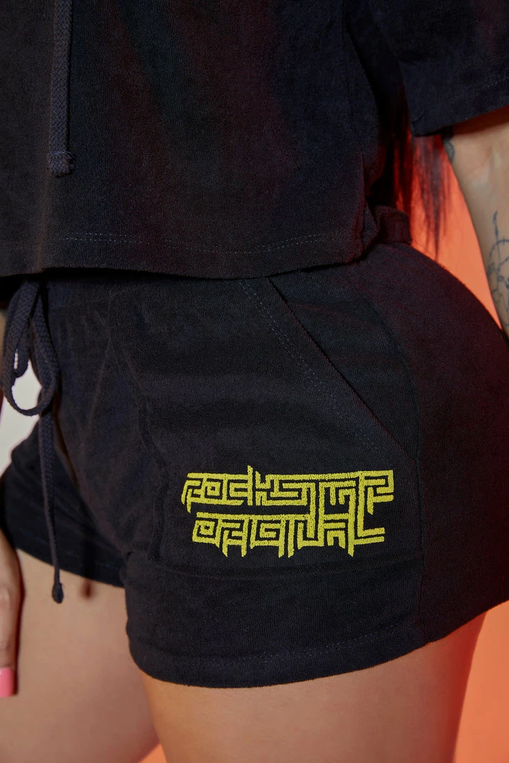 Rockstar Original Women’s two-piece short set in black. Featuring embroidered RSO logos on the top and bottoms with a soft knit terry material finish. Top accents a drawstring hood and cropped length while bottoms accent a ribbed drawstring waistband with side pockets. Style with strappy sandals or nude heels for a gorgeous beachside OOTD!