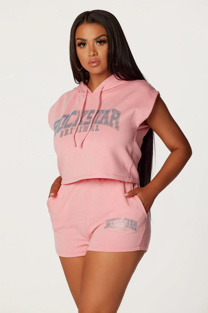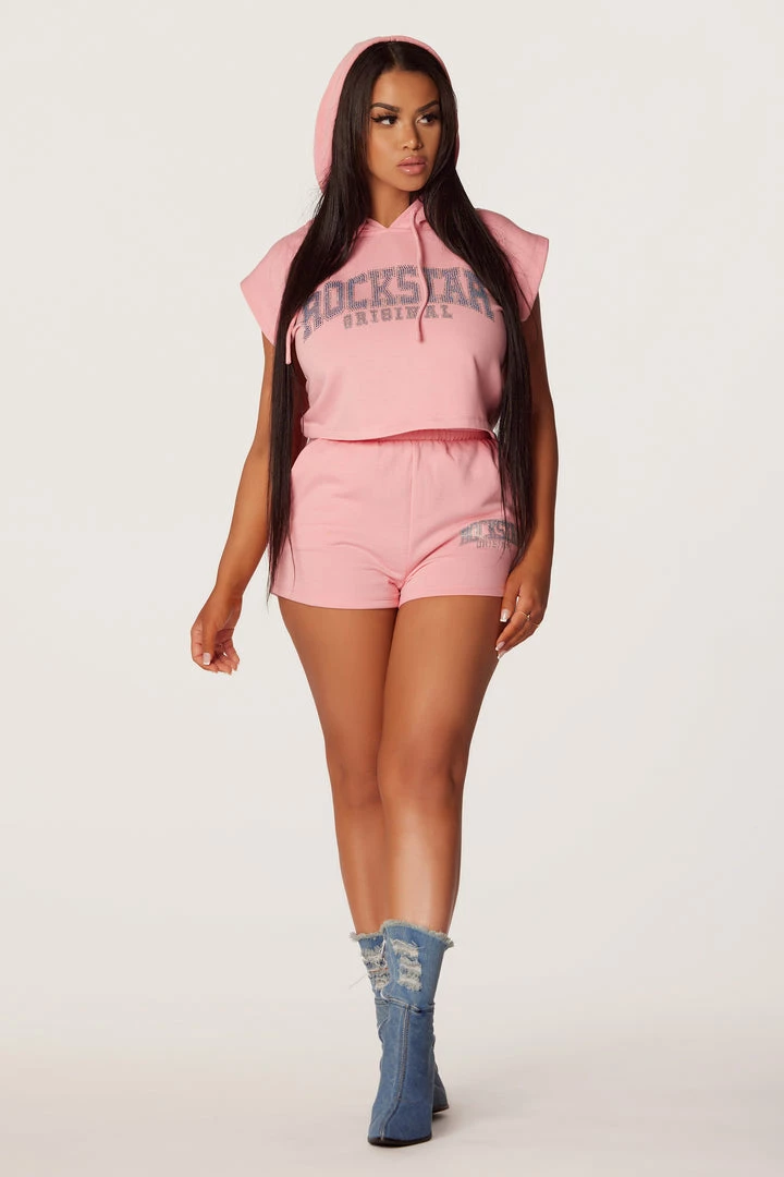 Rockstar Original Women’s two-piece short set in soft pink. Featuringย rhinestone RSO logos on the top and bottoms. Top accents a mini length withย short sleeves and a drawstring hood while bottoms accent an elastic waistband and side pockets. Style with your favorite sneakers for a sporty Rockstar babe OOTD!