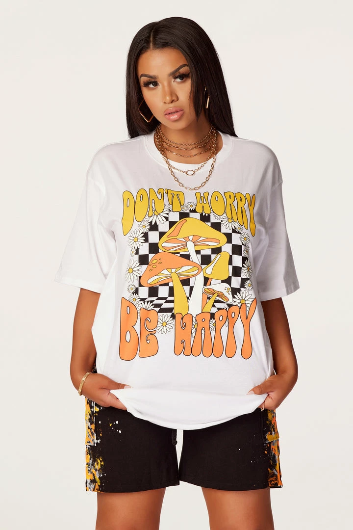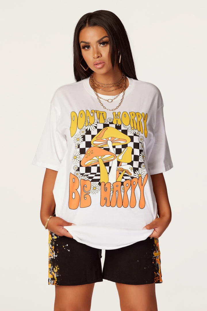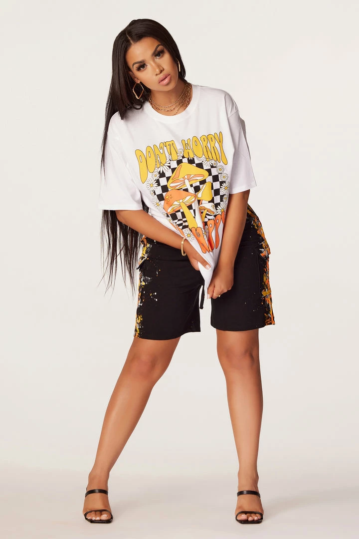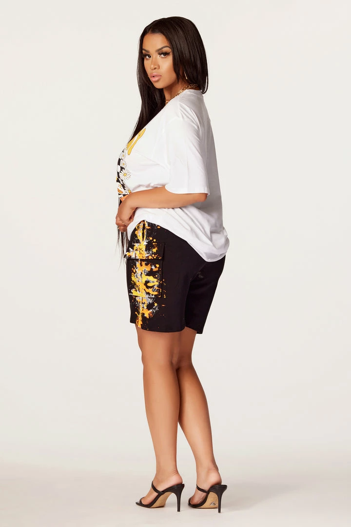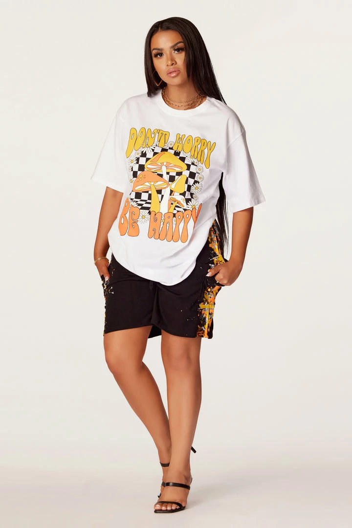 Rockstar Original Women’s two-piece short set. Featuring a printed logo with a custom mushroom graphic on the top while bottoms feature custom paint splatter detailing. Tee accents a crew neckline with an oversized fit while shorts accent a drawstring waistband with pockets and distressed detailing.