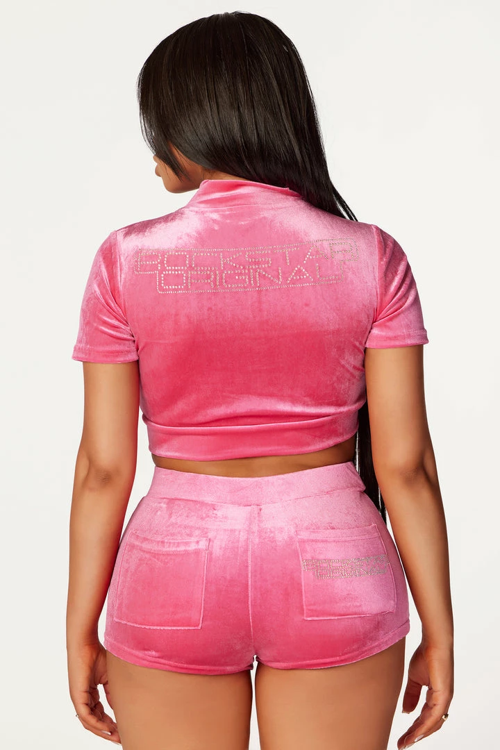Rockstar Original Women’s two-piece short set inย hot pink. Featuringย rhinestoneย RSO logos on the top and bottoms with a gorgeous velvet finish throughout. Jacket accents an embroidered Baby logo on the chest with a mini length, a high quality zipper closure, short sleeves and a baseball collar. Shorts accent a mini length with pockets and a drawstring waistband.