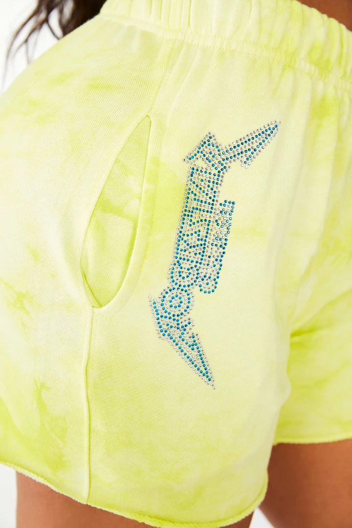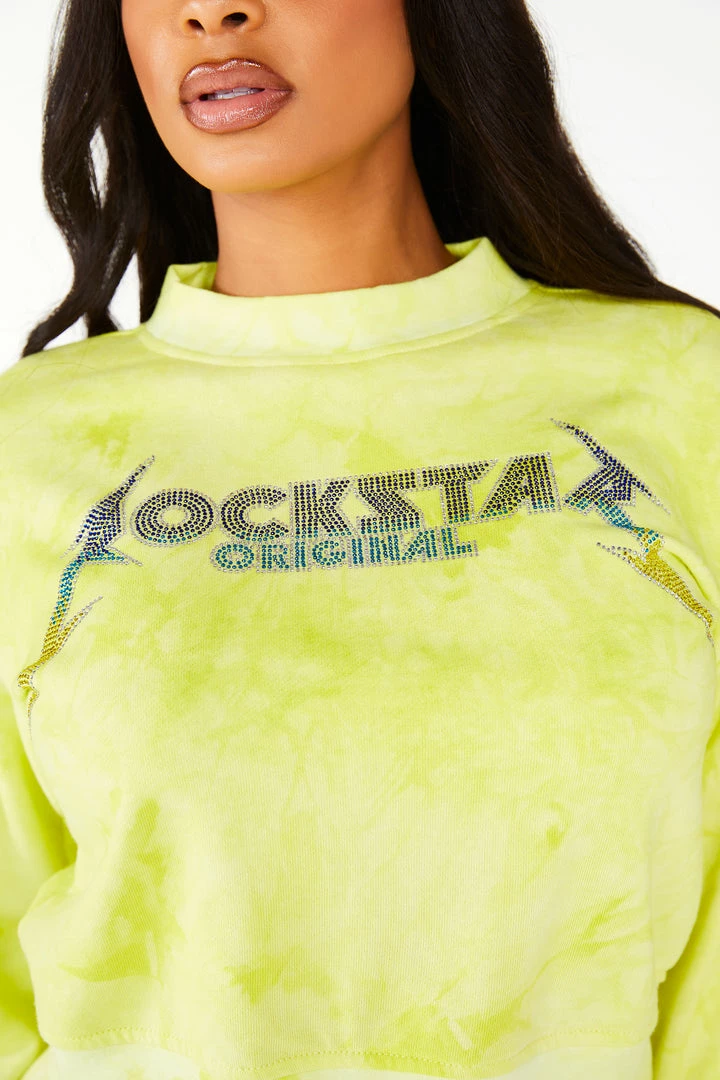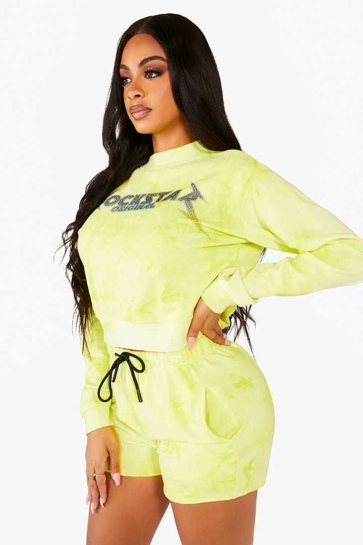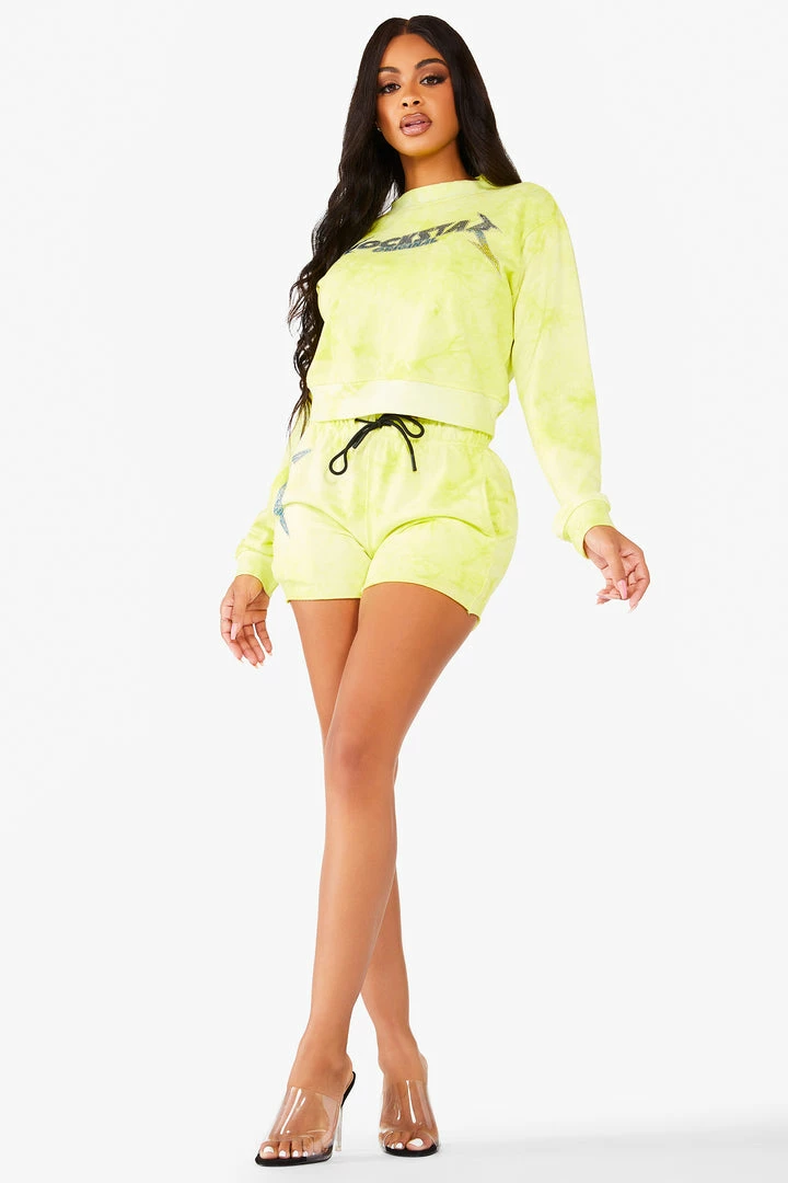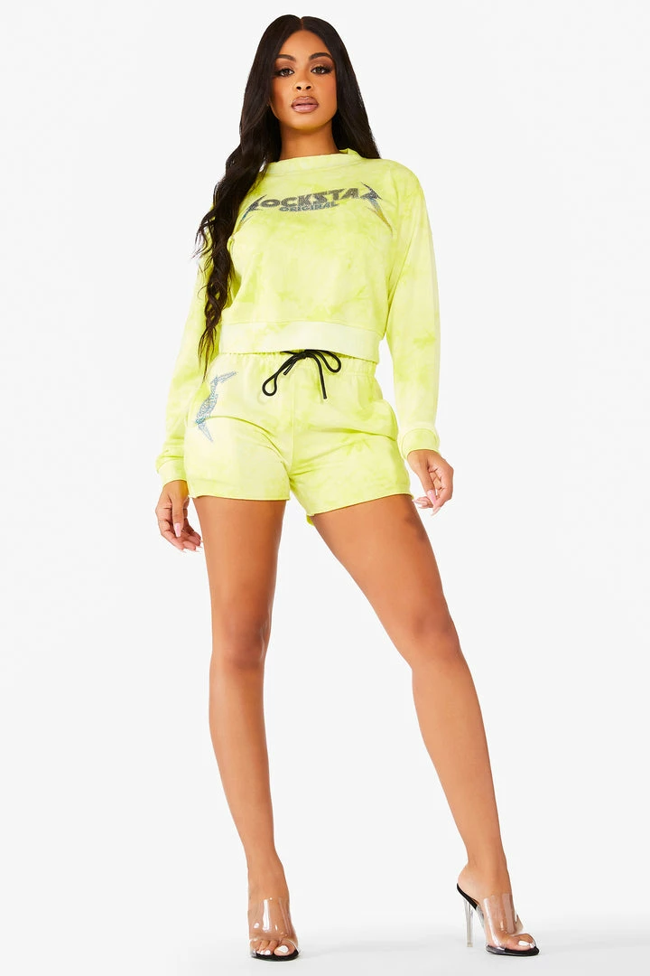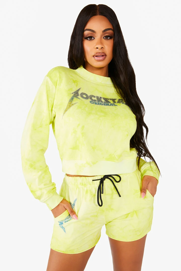 Rockstar Original Women’s pullover crew neck tie dye tracksuit set with cut off track short and bold crystal multi-color Rockstar Original logos.