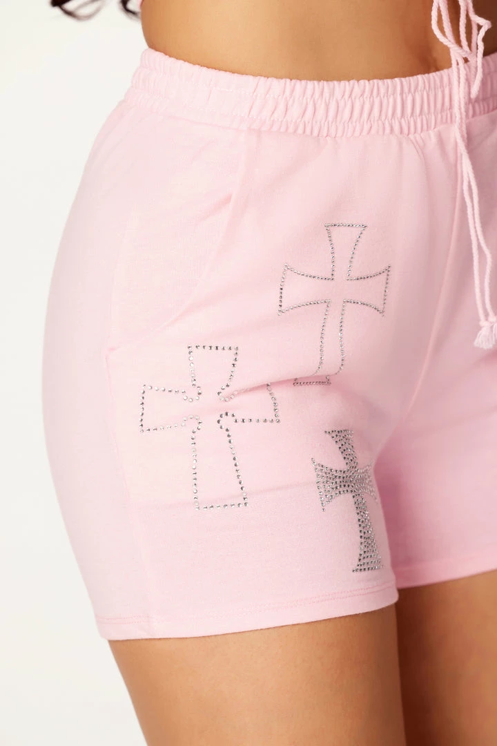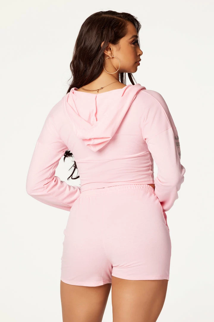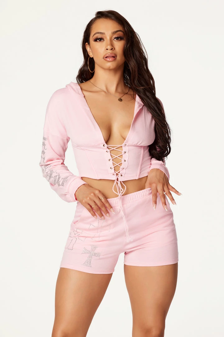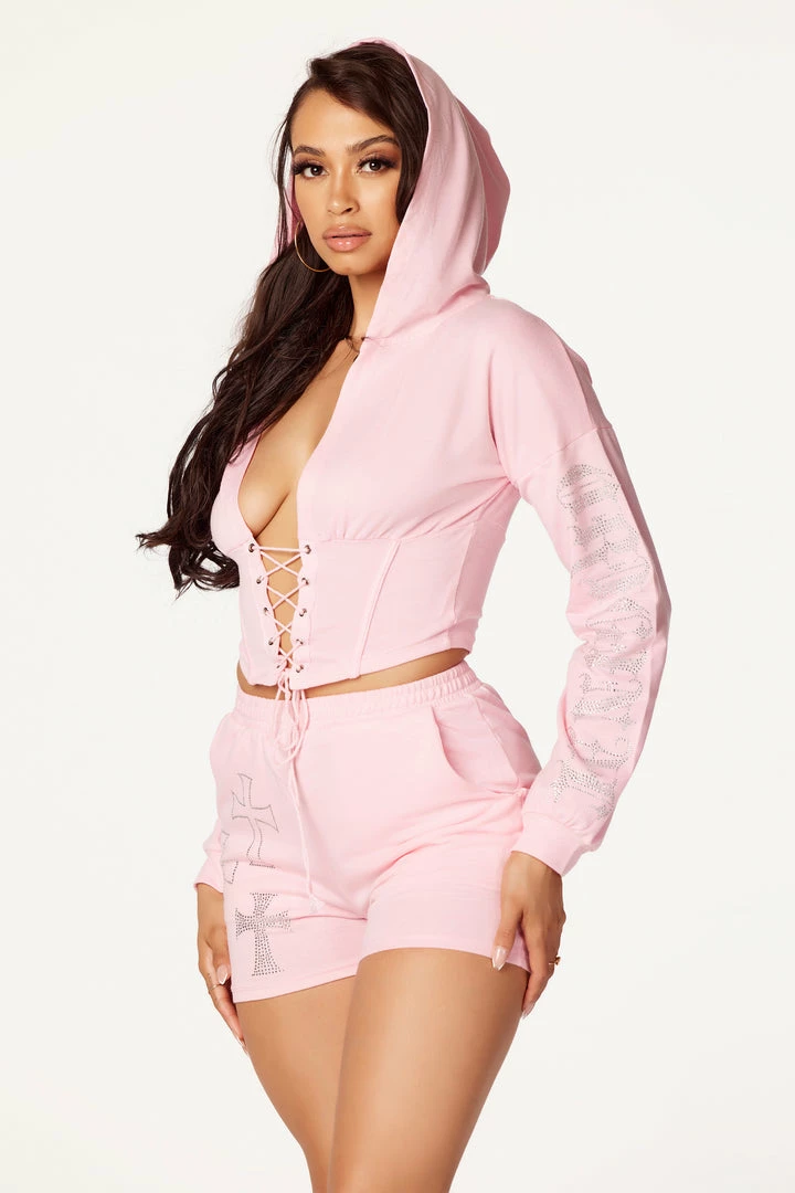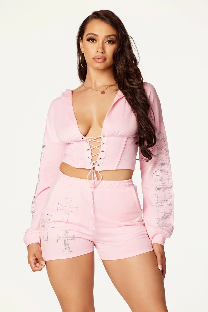 Rockstar Original Women’s two-piece tracksuit set in baby pink. Featuring rhinestone RSO logos and cross graphics on the top and bottom. Top accents a plunge neckline and front tie closure with a hood to match. Bottoms accent an elastic waistband and relaxed fit. Stay comfy and on point with this must-have set!