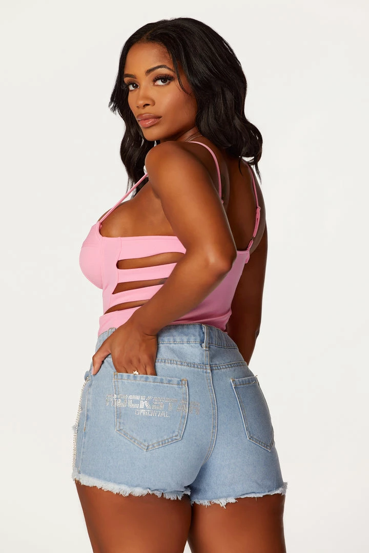 Rockstar Original Women’s denim shorts in light wash. Featuring a posterior rhinestone RSO logo with embellished chain frays on the front. Accenting distressed detailing with a coin pocket and a high-quality front button closure,