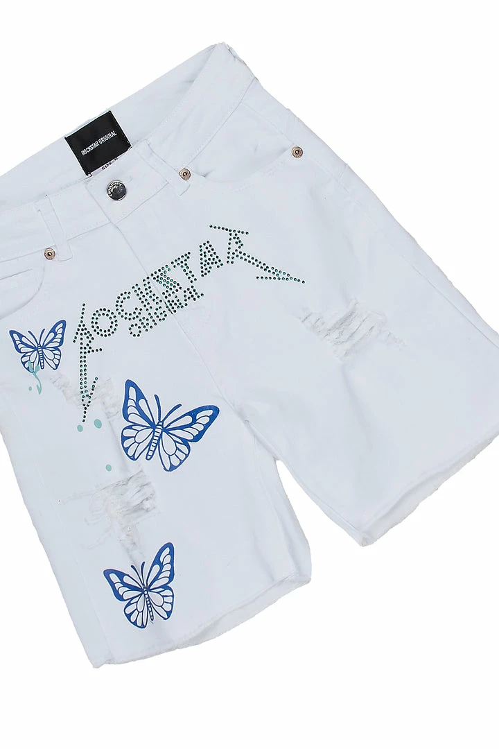 Rockstar Original Women’s denim shorts in white.ย Featuring a rhinestone RSO logo with multi color cross graphics throughout. Accenting a high-waisted, form-fitting silhouette with a high quality front button closure, multiple pockets and distressed detailing.ย