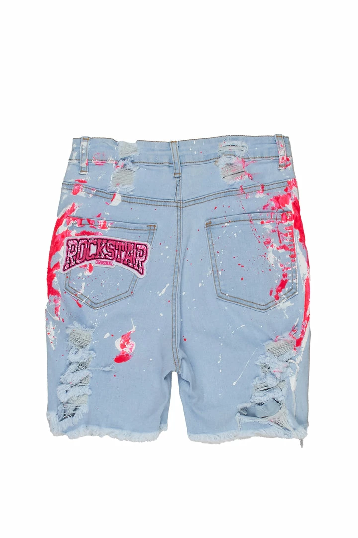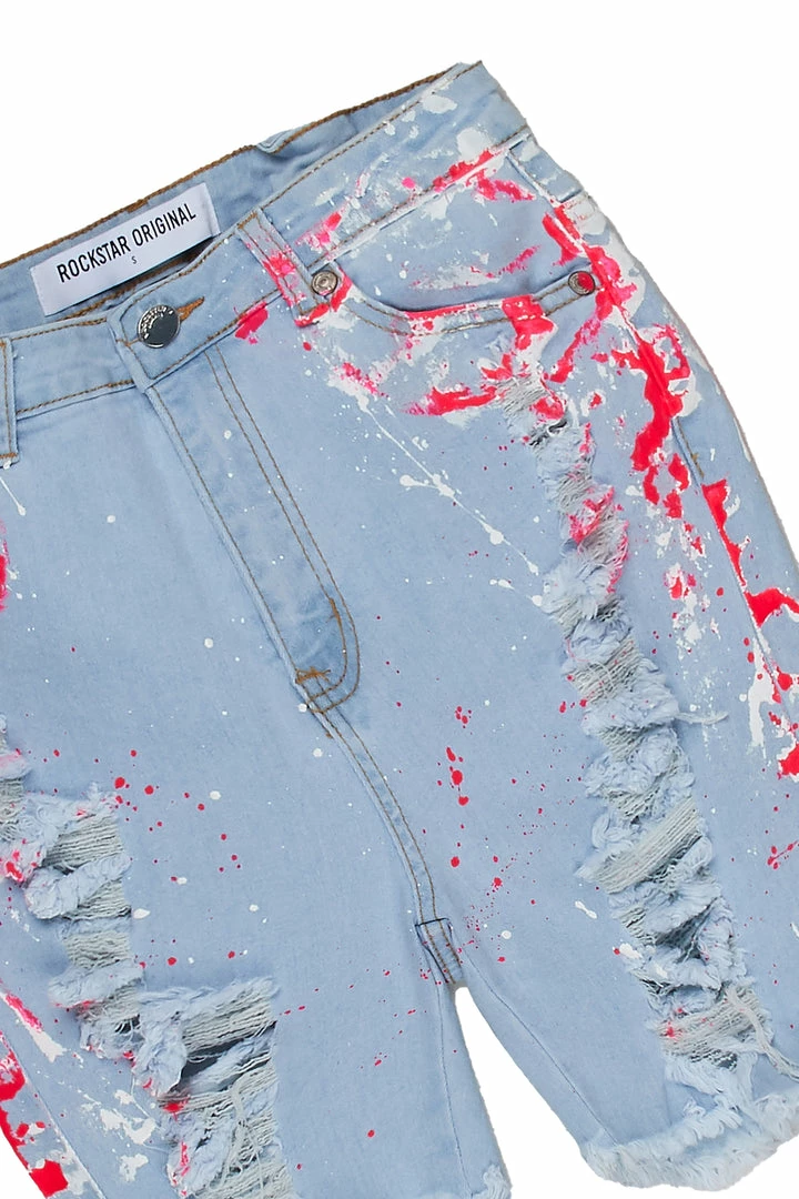 Rockstar Original Women’s denim shorts in light wash. Featuring a posterior RSO logo with custom paint splatter throughout to match. Accenting a high-waisted, form-fitting silhouette with a high quality front button closure, multiple pockets and distressed detailing.