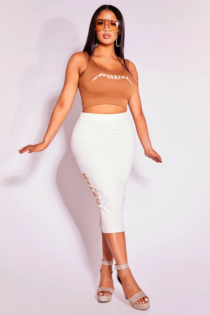 Rockstar Original Women’s rib knit skirt in cream. Featuring a bodycon silhouette and rhinestone RSO logo. This skirt is the perfect staple piece for casual wear or a going-out look! Style with a basic loose tee or sexy corset top for the hottest fit this season!