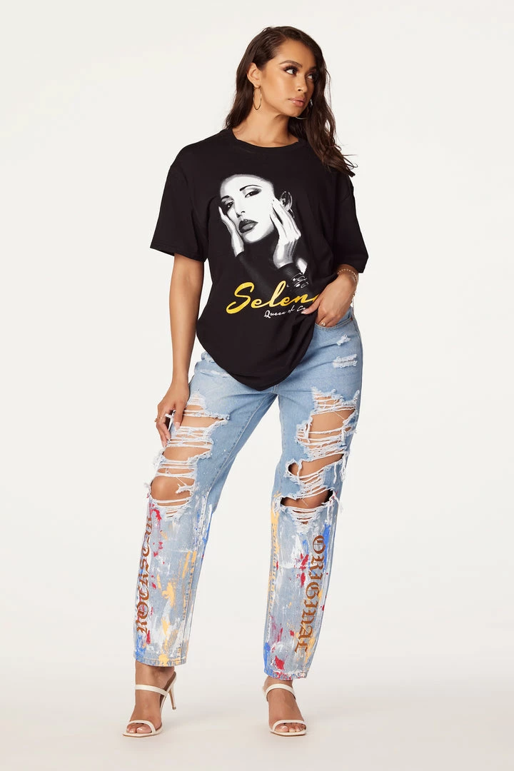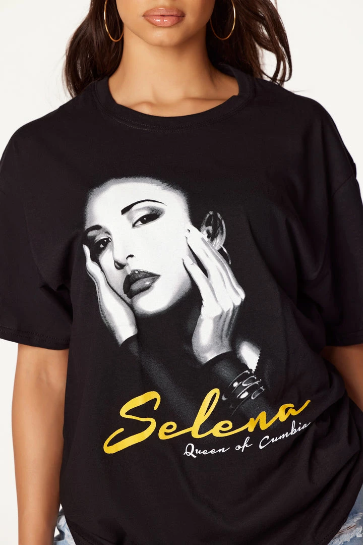 Rockstar Original Women’s tee in black. Featuring a Selena portrait with a Queen of Cumbia logo. Accenting a crew neckline with a relaxed, oversized fit. Style with biker shorts for a sporty Rockstar babe look!