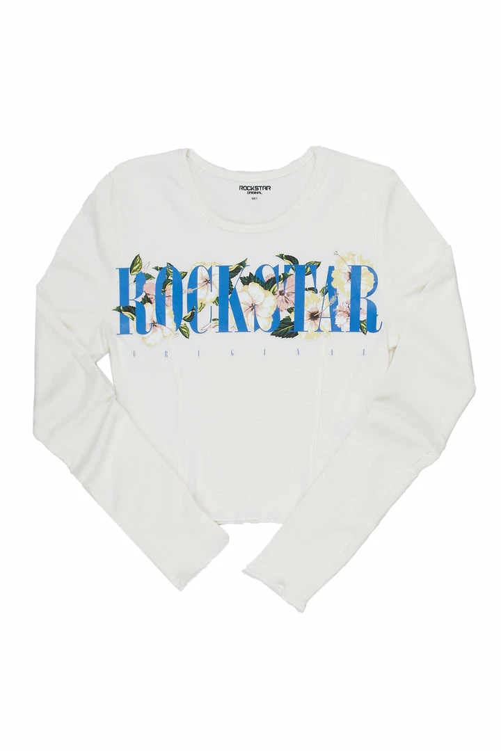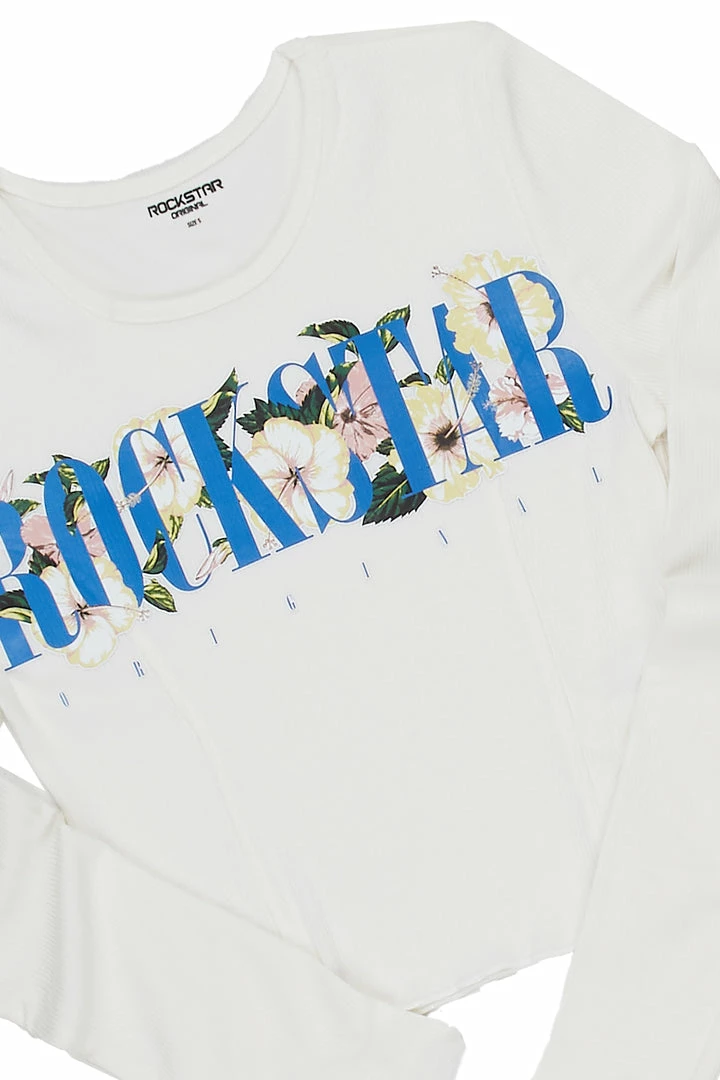 Rockstar Original Women’s long sleeve tee in white. Featuring a printed RSO logo with multi color floral graphics to match. Accenting a crew neckline with a cropped length.