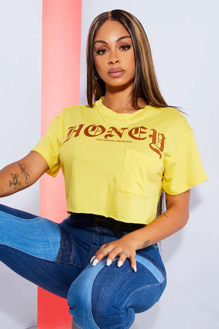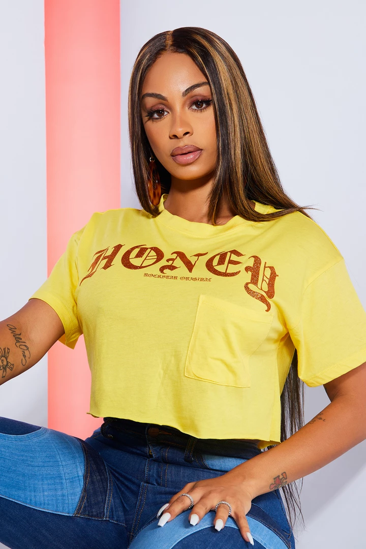 Rockstar Original Women’s crop top tee in mellow yellow. Featuring a printed logo across the bust with a crew neckline and loose, relaxed fit. This comfy fit basic tee is your new must-have staple piece for staying in, going out or getting a workout in!