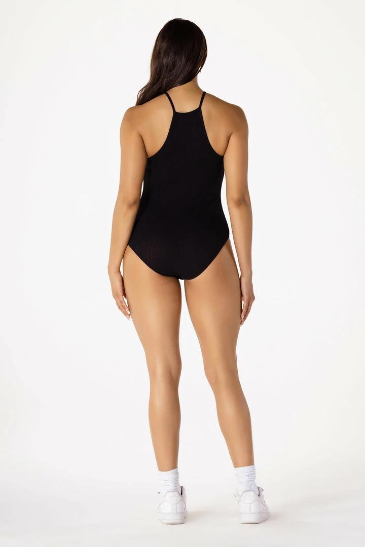 Rockstar Original Women’s essential cami bodysuit in black. Featuring a printed RSO logo across the bust with a sleeveless, halter neckline design. Accenting ribbed stretch material and a button clasp closure.