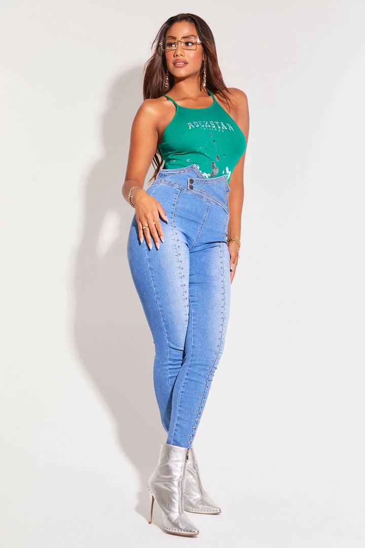 Rockstar Original Women’s one-piece cami bodysuit in green. Featuring a rhinestone RSO logo across the bust with metallic silver paint splatter detailing throughout. Accenting a halter neckline, ribbed stretch material and a button clasp closure. Style with your favorite denim and heels for the ultimate Rockstar babe OOTD.