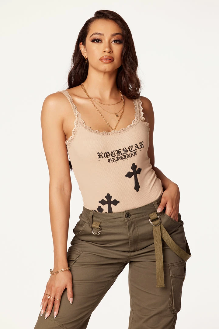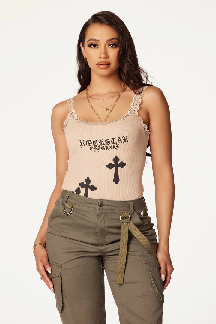 Rockstar Original Women’s one-piece cami bodysuit in beige. Featuring a printed RSO logo across the bust with cross graphics to match. Accenting a scoop neckline with lace trim, ribbed stretch material and a button clasp closure. Style with your favorite denim and heels for the ultimate Rockstar babe OOTD.