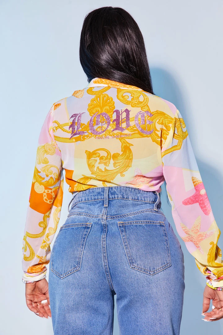 Rockstar Original Women’s multi color long sleeve chiffon top. Featuring sheer puff sleeves with fitted cuffs and a front tie closure. Accentingย a lightweight design for a gorgeous all day comfort staple piece.