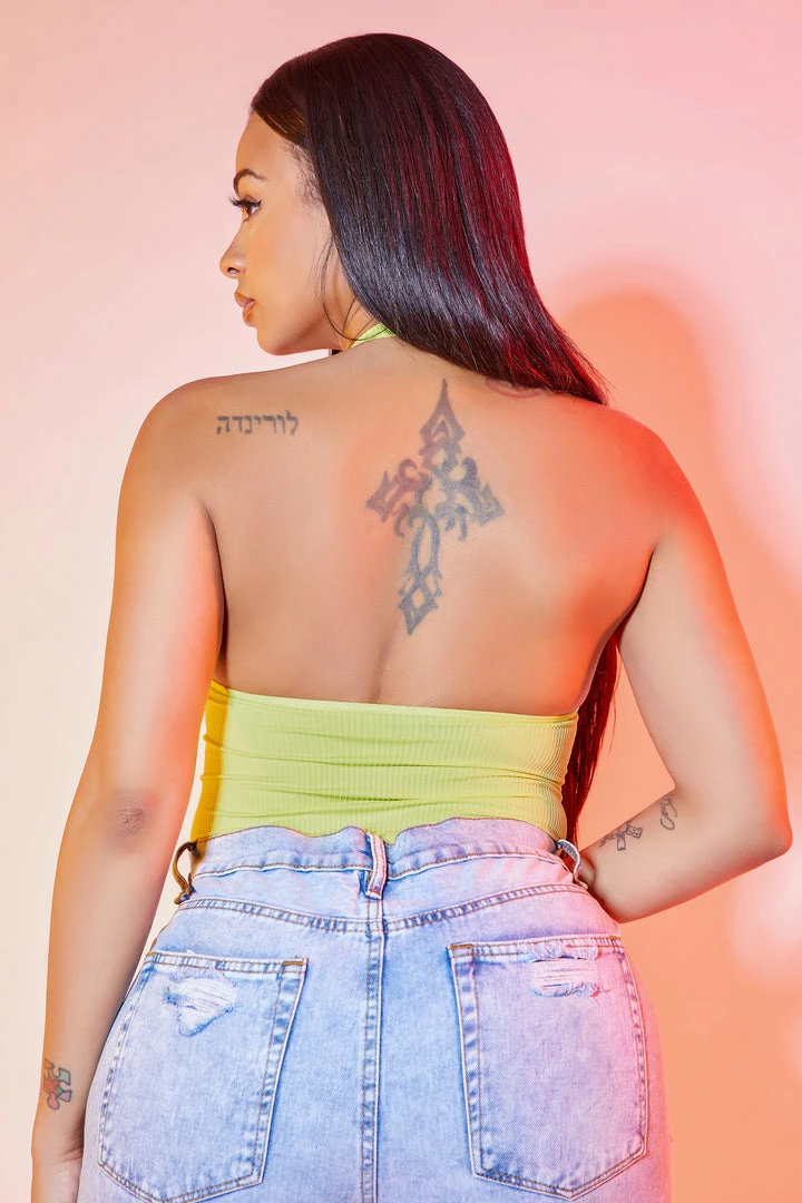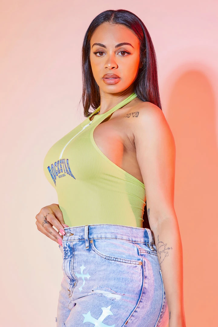 Rockstar Original Women’s one-piece cami bodysuit in soft neon green. Featuring a printed RSO logo across the bust. This staple piece top accents a halter neckline with a high quality front zipper, backless design and a button clasp closure. Style with denim shorts for a casual Rockstar babe ‘fit!