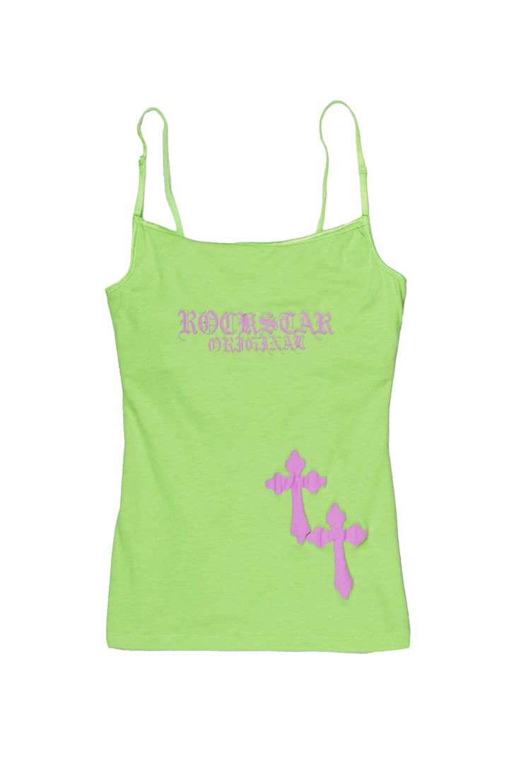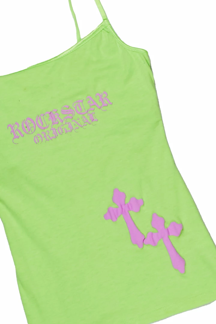 Rockstar Original Women’s tank top in neon green. Featuring a printed RSO logo with cross graphics to match. Accenting a square neckline with skinny straps and a form-fitting silhouette, regular fit.