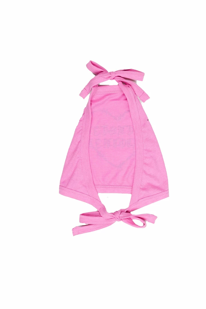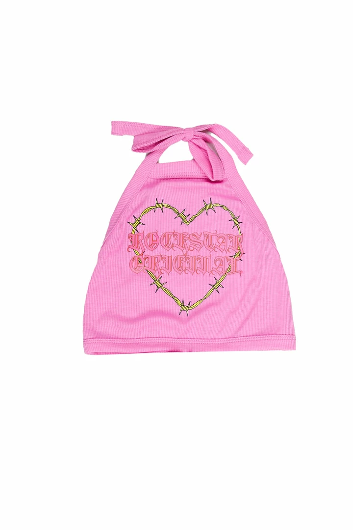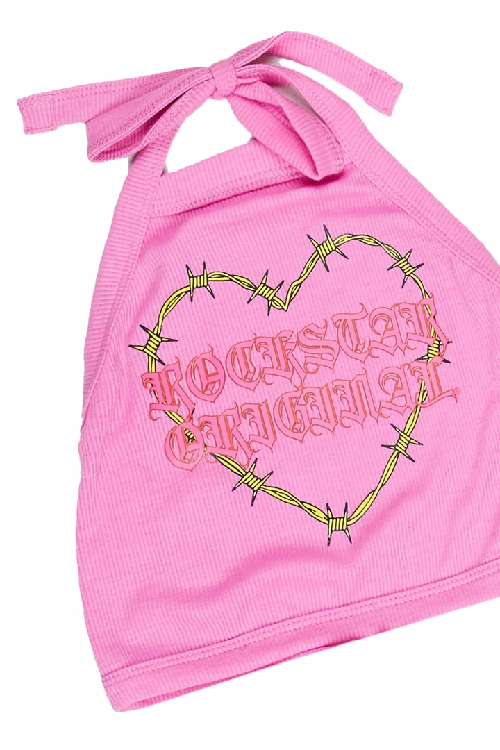 Rockstar Original Women’s tank top in soft pink. Featuring a printed RSO logo with a heart graphic to match. Accenting a halter top design with a tie-up closure and cropped length. Style this staple piece with denim jeans for a casual outfit.