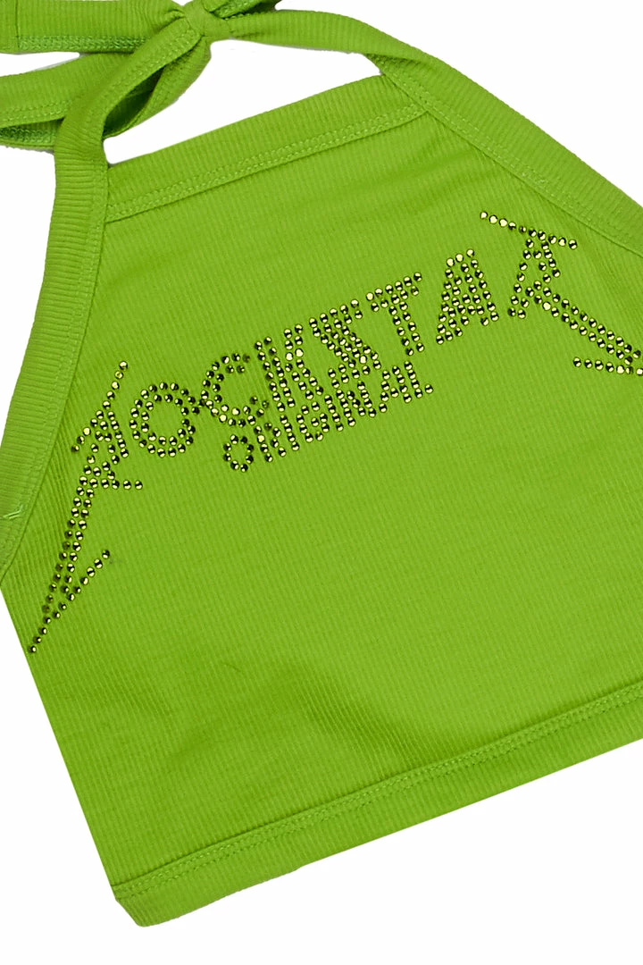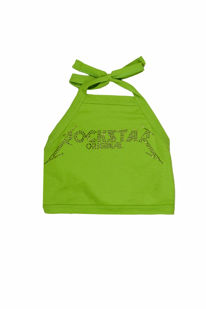 Rockstar Original Women’s tank top in neon green. Featuring a rhinestone RSO logo with a tie-up closure. Accenting aย halter top design with a cropped length.ย