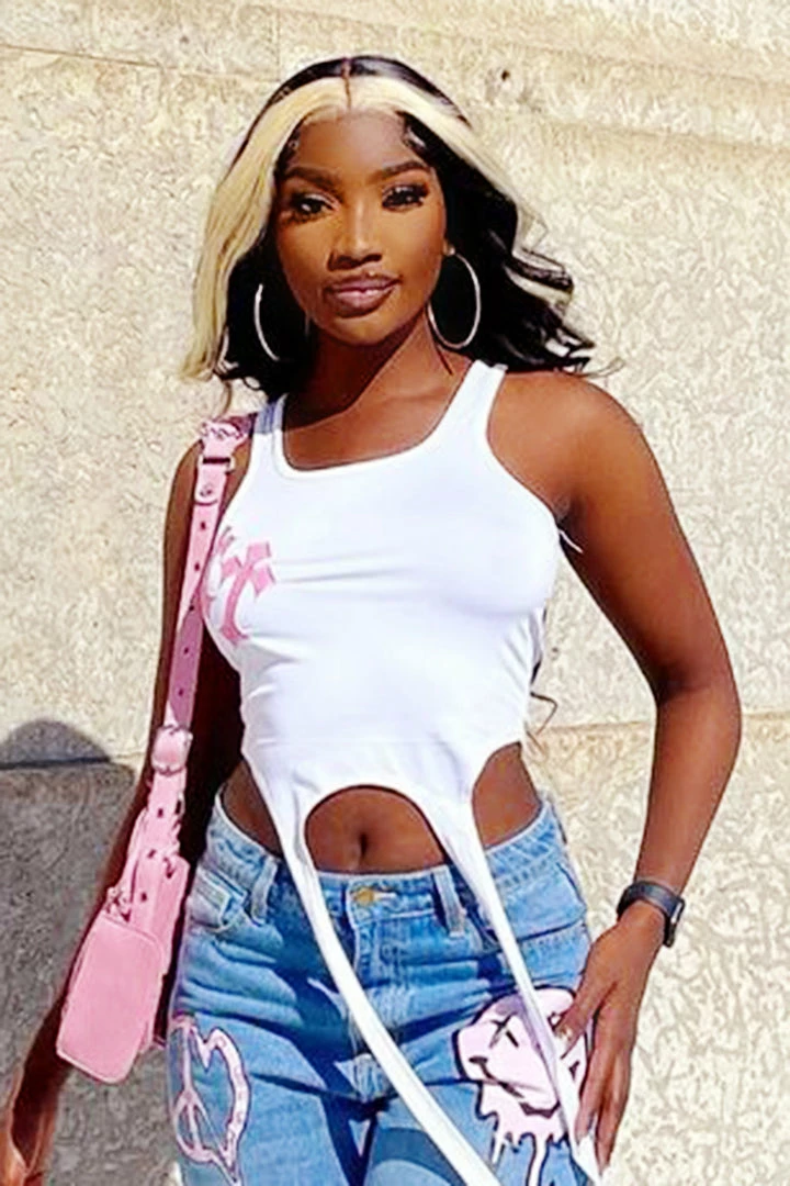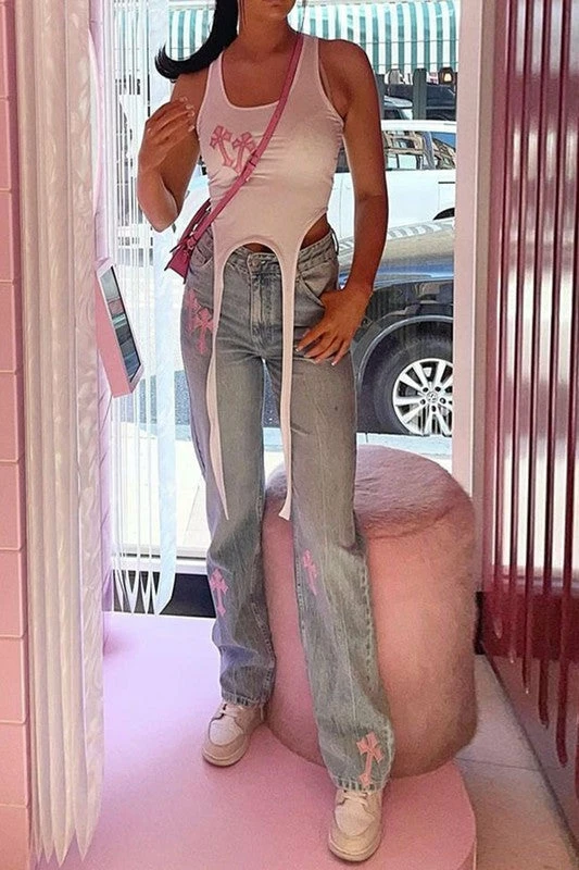 Rockstar Original Women’s tank top in white. Featuring printed pink crosses with a scoop neckline and elongated front hem straps. Accenting a form-fitting silhouette and ultra soft cotton for a comfortable staple piece.