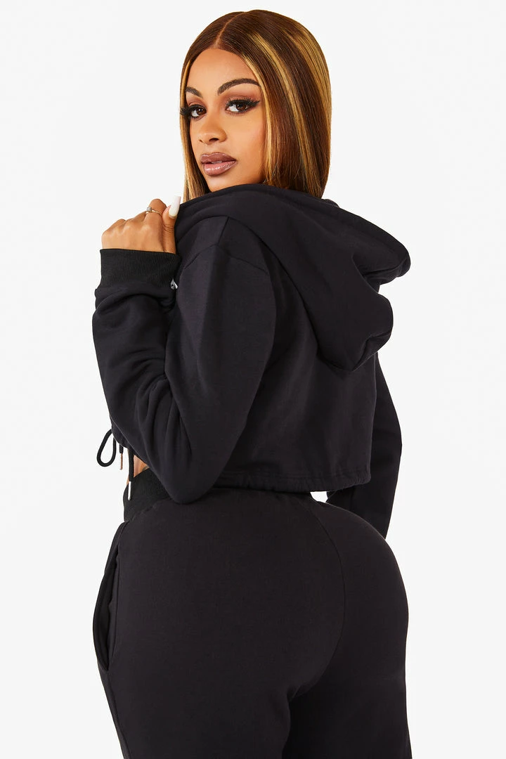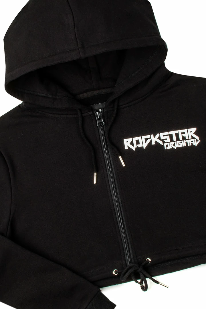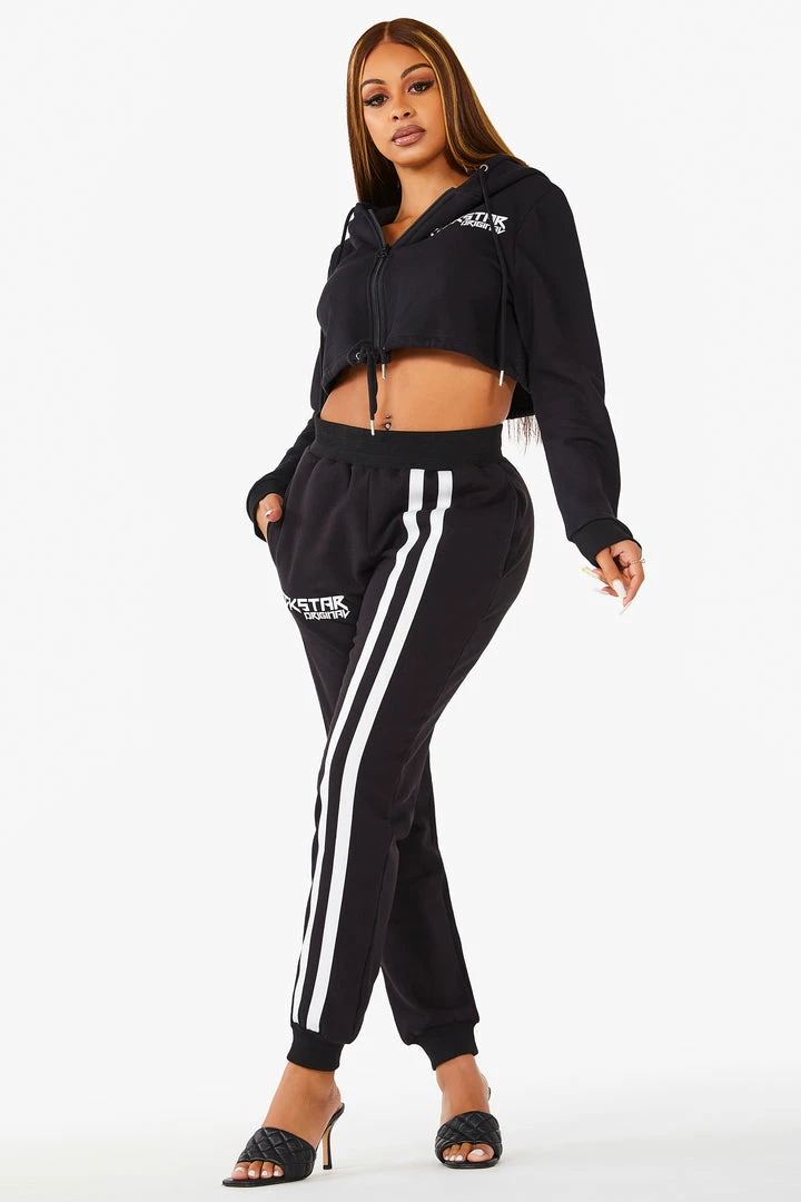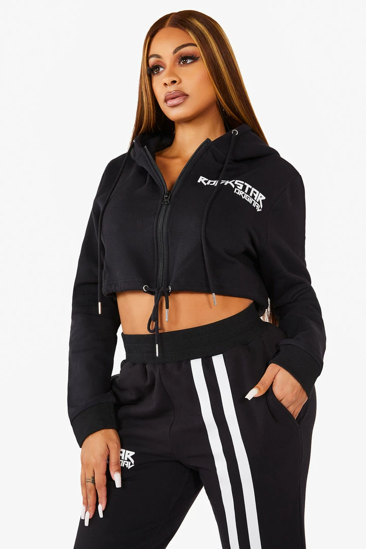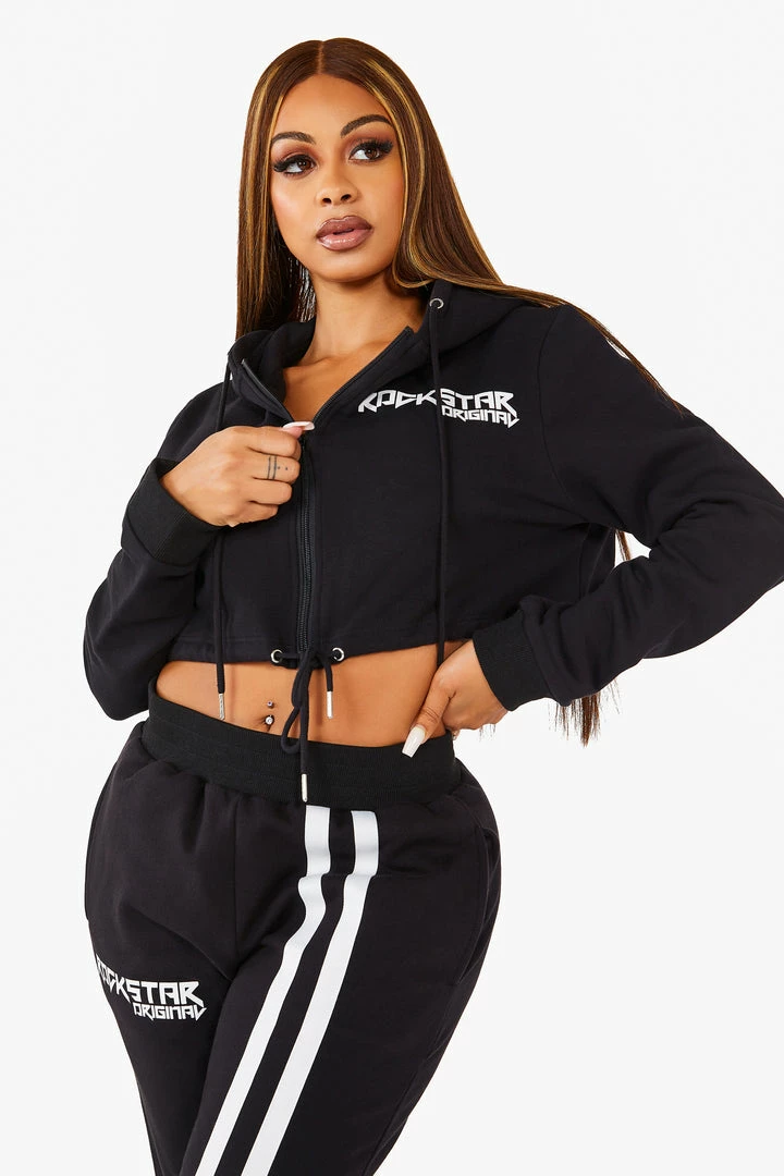 Rubi Rose x Rockstar Original Women’s two-piece crop top tracksuit set in chicest black. Featuring printed RSO logos on the top and bottoms with a stripe designing on the pant. Stay fitted and fashion-forward with this set that accents a drawstring hood and hem, high quality zipper closure, fitted waistband and pockets for comfort and convenience.