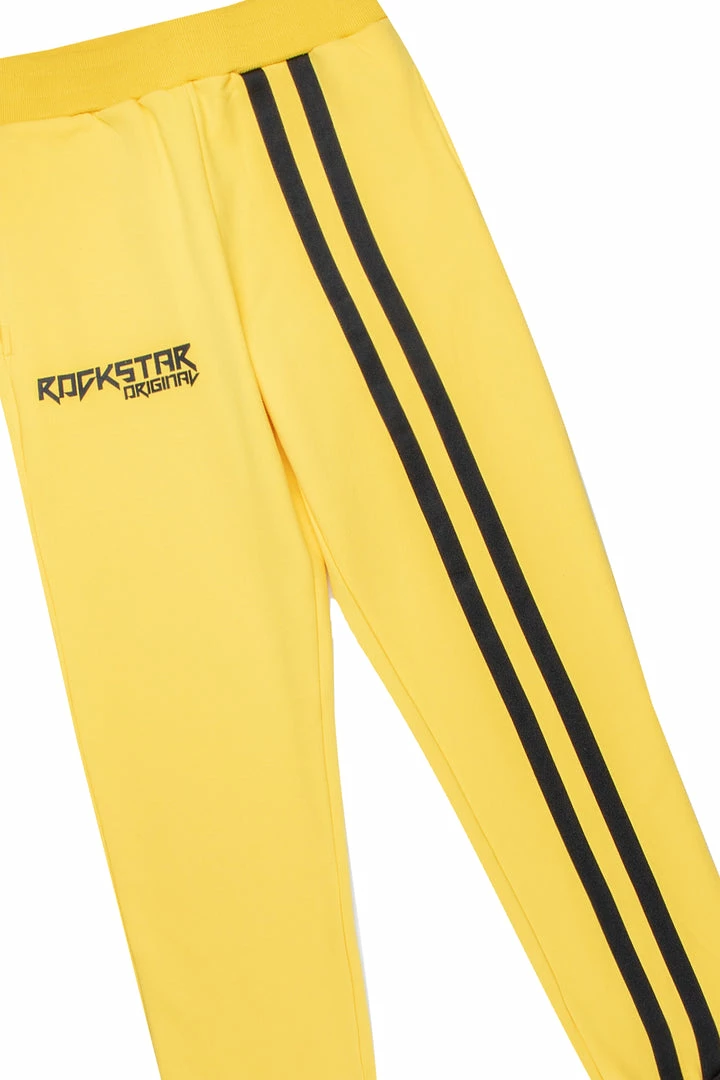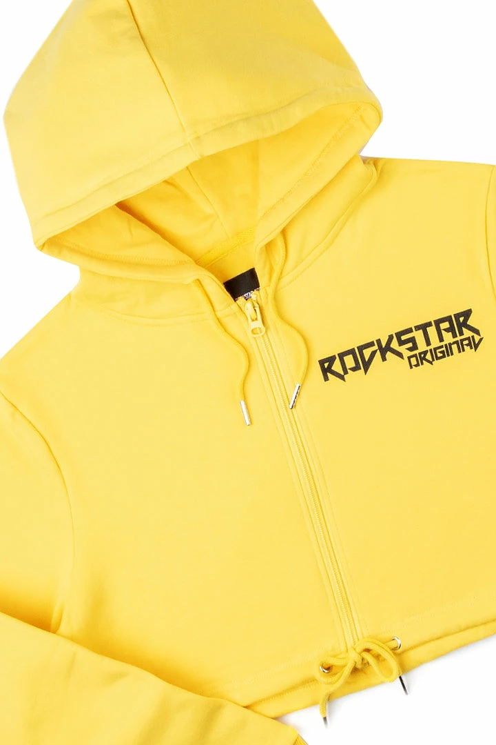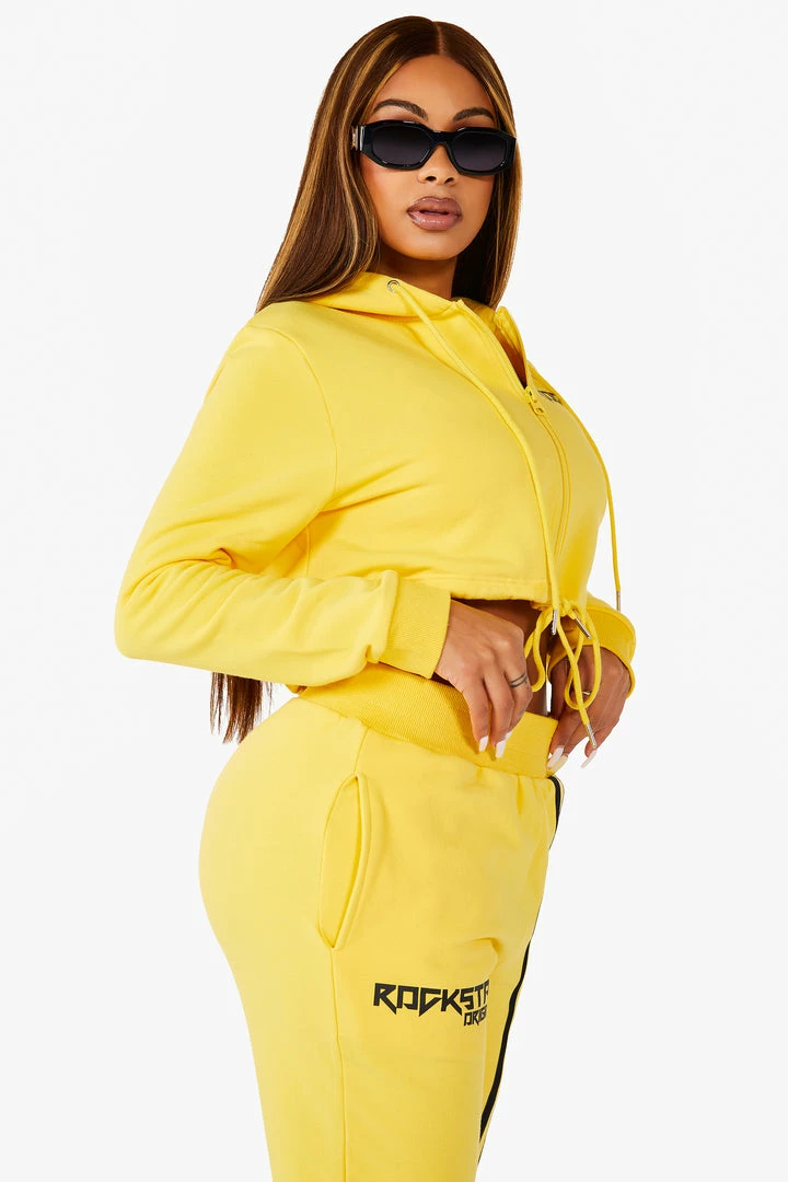 Rockstar Original Women’s two-piece crop top tracksuitย set in anything but mellow yellow. Featuring printed RSO logos on the top and bottoms with a stripe designing on the pant. Stay fitted and fashion-forward with this set that accents a drawstring hood and hem, high quality zipper closure, fitted waistband and pockets for comfort and convenience.