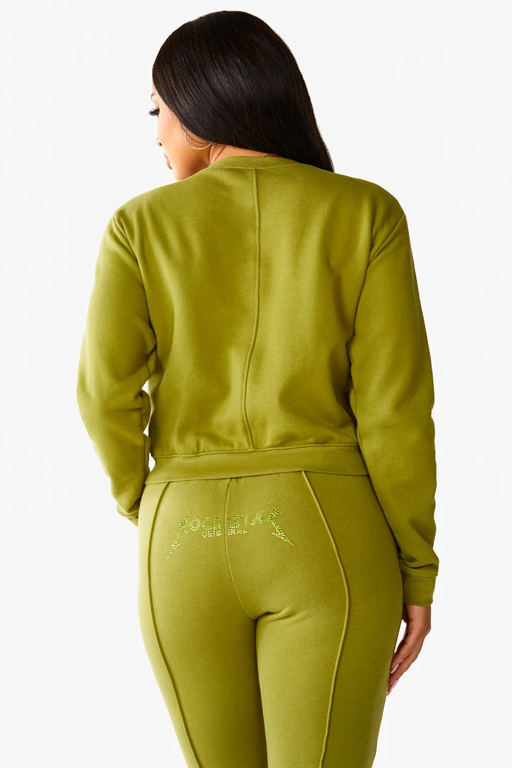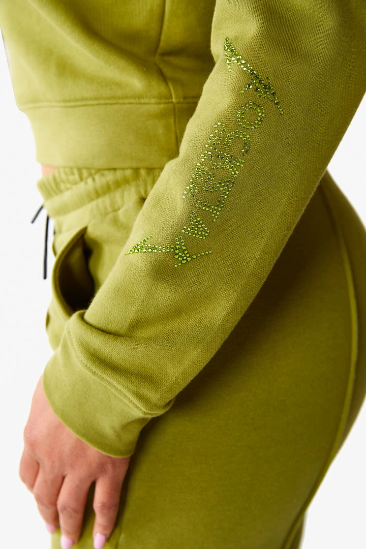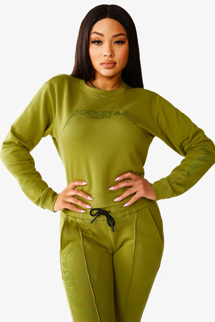 Rockstar Original Women’s two-pieceย matching jogger set in olive green. Featuringย rhinestone RSO logos throughout the top and bottoms. Top accents a crew neckline with long sleeves, ribbed cuffs and hem with a cropped length. Bottoms accent an elastic drawstring waistband with side pockets, ribbed cuffs and pintuck pleated stitching.