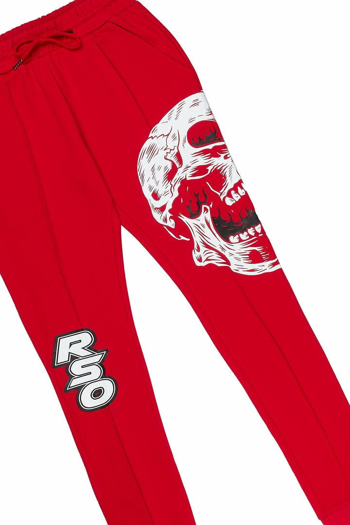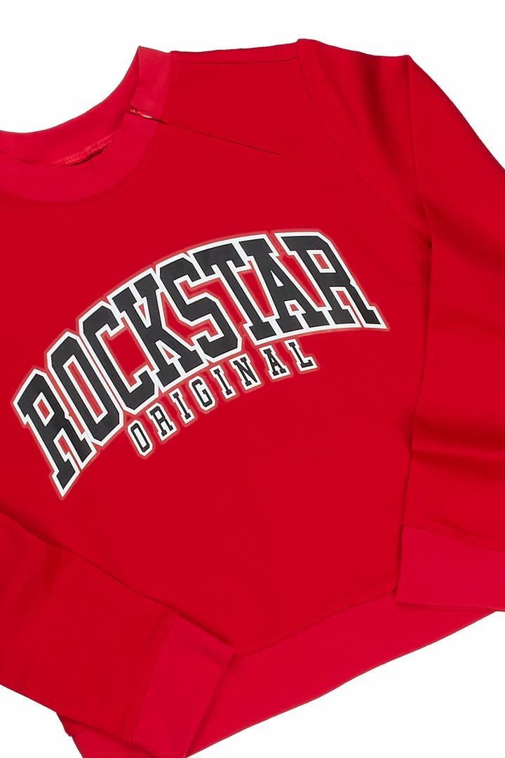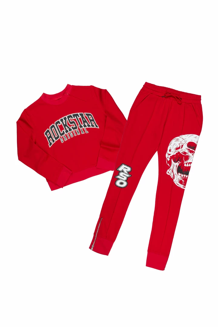 Rockstar Original Women’s two-piece tracksuit set in red. Featuringย printed RSO logosย throughout the top and bottoms. Top accentsย a mini crewneck length while the bottoms accent a skull graphic with a drawstring waistband, side pockets and high quality ankle zipper hems.ย