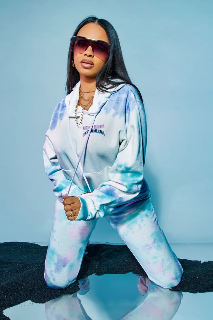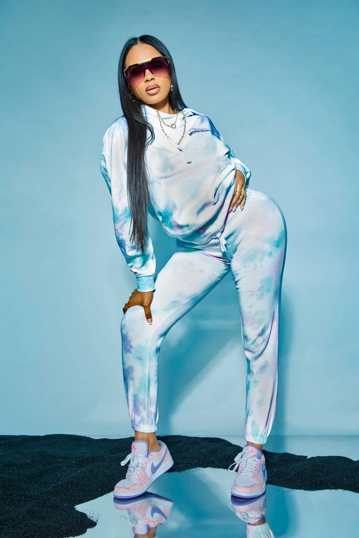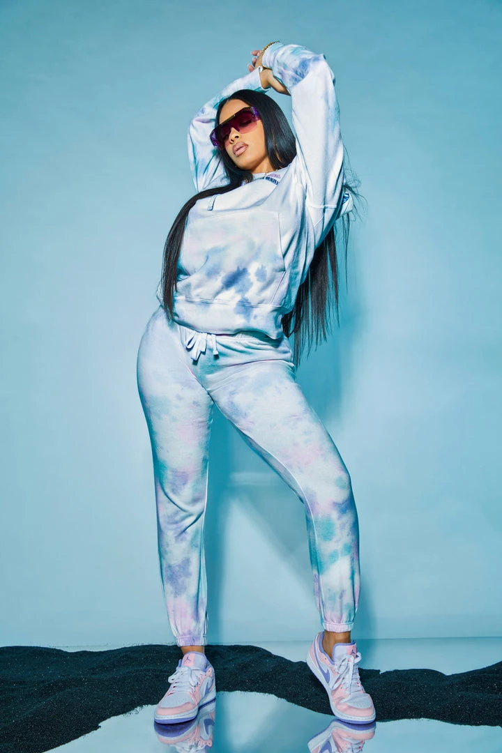Rockstar Original Women’s two-piece tracksuit set in sky blue. Featuring printed RSO logos on the top and bottoms. Top accents a drawstring hood with ribbed cuffs and hem while bottoms accent a drawstring waistband, side pockets and elastic ribbed cuffs. Style with sneakers for a sporty Rockstar babe outfit.