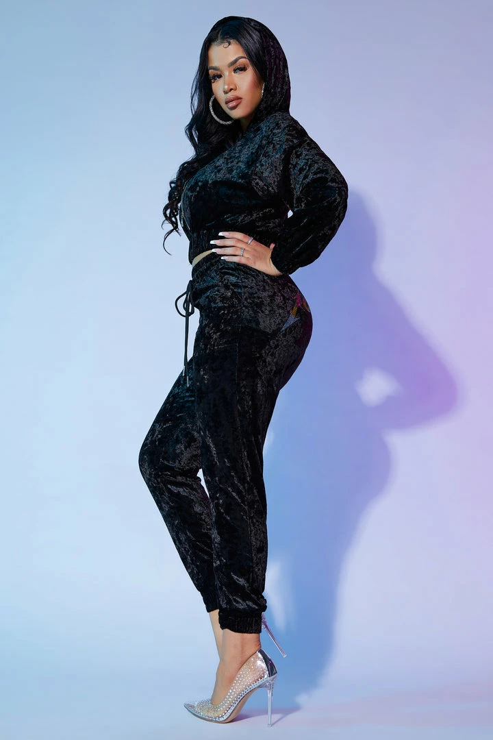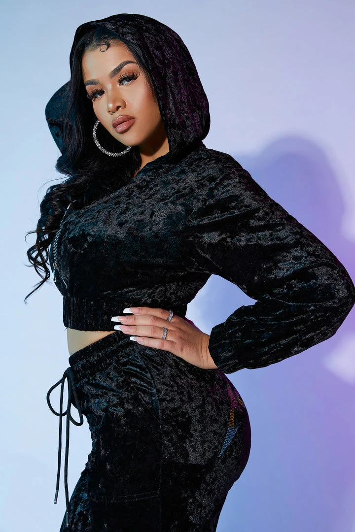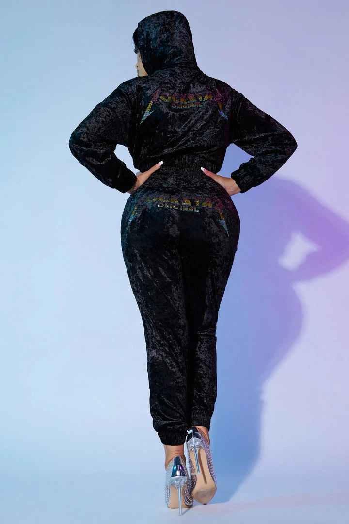Rubi Rose x Rockstar Original Women’s three-piece tracksuit set in boss babe black. Featuring a crop styled zip-up hoodie with a bandeau top to match, a centered rhinestone RSO logo, drawstring waistband and elastic cuffs. This tone setting three-piece accents a smooth, velvet finish throughout for more than just style. The perfect ensemble for all day wear.